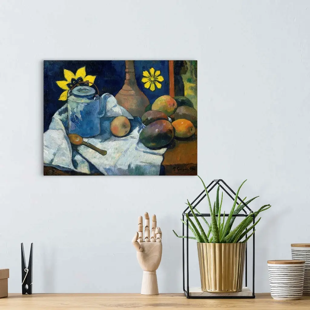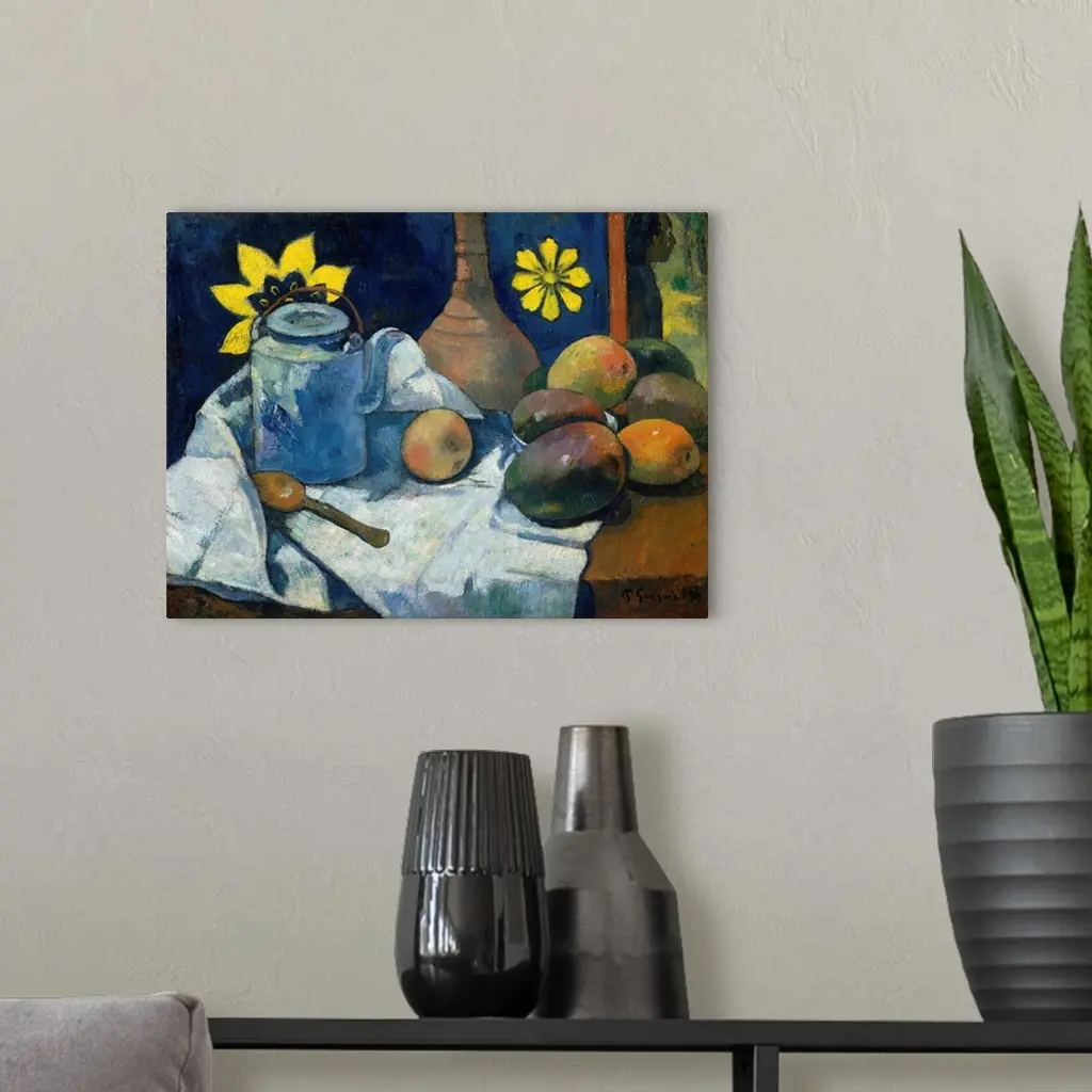One of Gauguin's most treasured possessions was a painting by Cezanne, Still Life with Fruit Dish?(1879-80, now Museum of Modern Art, New York ), which he emulates in this picture. Within a similarly compressed space, Gauguin substituted mangoes for Cezanne's apples and a Tahitian-style printed cloth for a French floral wallpaper design. One significant departure is the human figure at the upper right, glimpsed through a door or window. The year after he completed this work, Gauguin's finances were so dire that he arranged for the sale of his prized Cezanne.