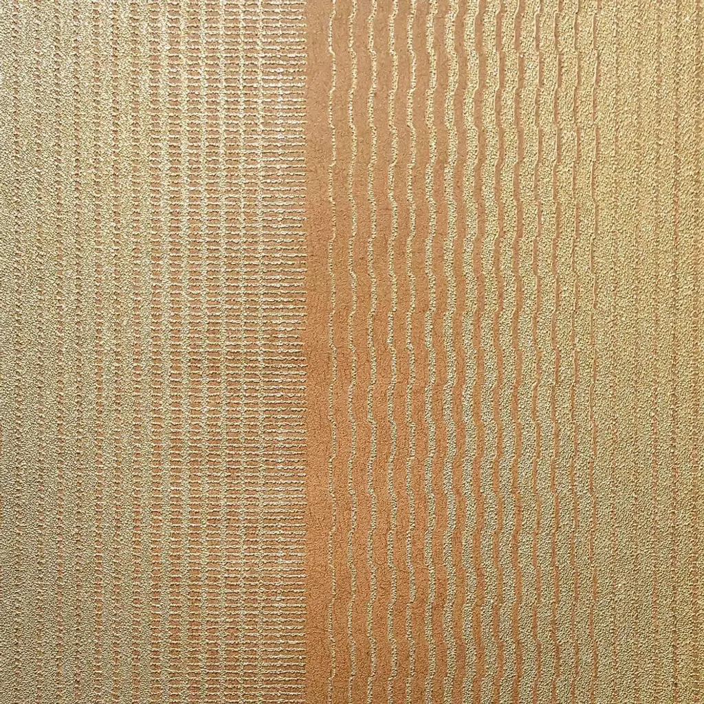 Beautiful vertical stripe pattern on a textural metallic hessian cloth ground. A gold and brown coloration. Hand crafted by artisans, no two rolls are alike and intricacies between these are part of the inherent beauty of the wallcovering. From Tones & Textures V2 Fan Deck by JF Fabrics.