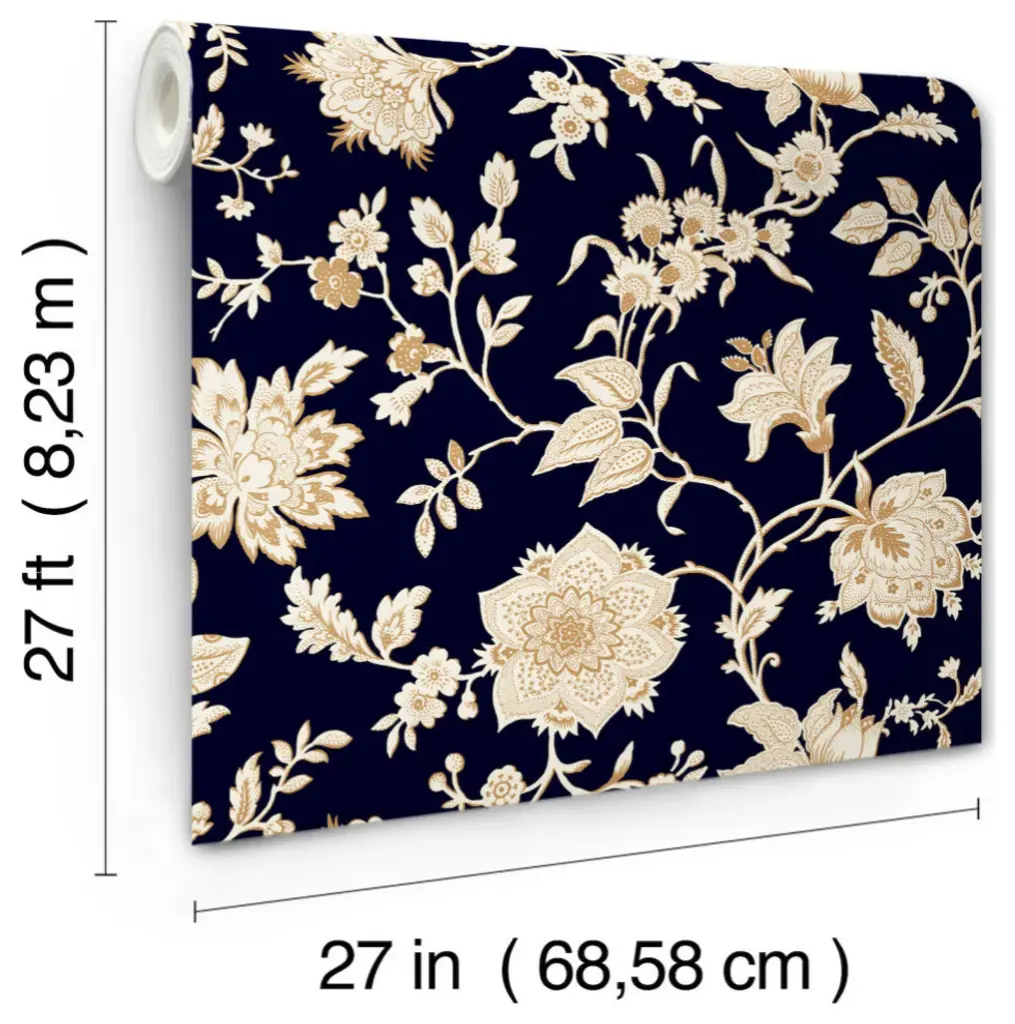 The refined Jacobean block print of pattern Sutton is detailed in white and metallic gold ink along a black background. This Sutton Wallpaper measures approximately 27 inches wide by 27 feet long, measuring approximately 60.8 square feet per roll. The quintessential design for timeless romance, toile traces its origins to 18th century fabrics. This celebrated motif is explored with a range of classical reproductions and modern reimaginings. Unpasted non woven material; 25.25-in repeat, drop match; Washable and strippable; 27-in by 27-ft long roll; Covers about 60.8 square feet