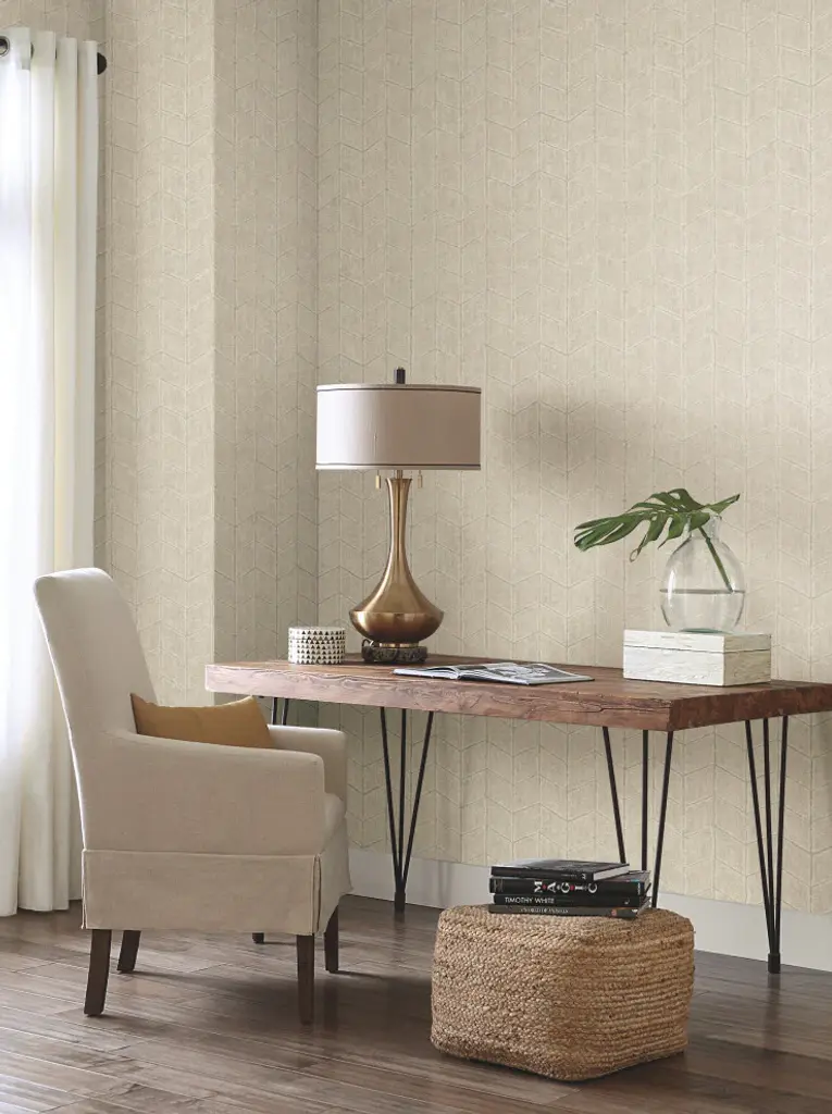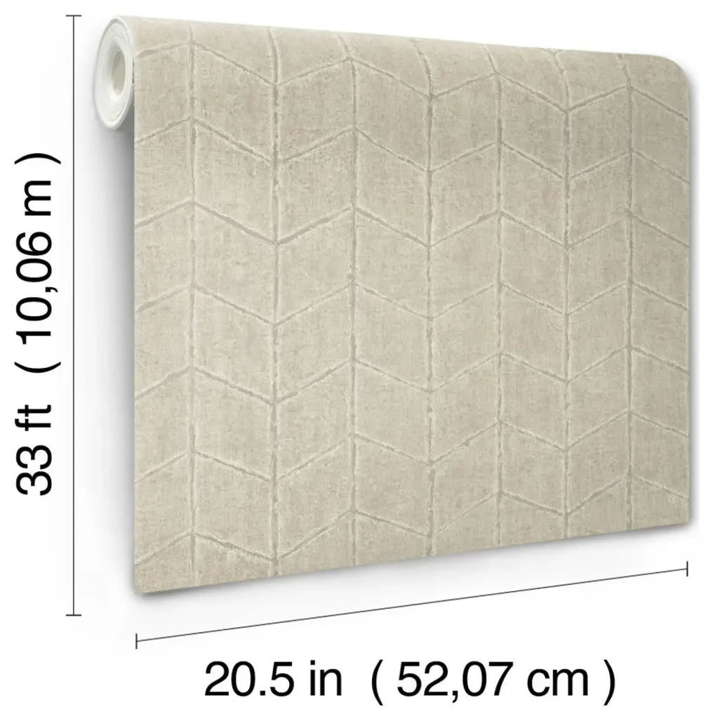 The chevron gets a modern, industrial upgrade when stylized with raised textural plaster relief and metallic in the pattern Flatiron Geometric, shown in taupe brown with gray. This Flatiron Geometric Wallpaper measures approximately 20.5 inches wide by 33 feet long, measuring approximately 56.4 square feet per roll. The modern aesthetic of natural form. Unpasted non woven material20.5-in repeat, straight matchWashable and strippable20.5-in by 33-ft long rollCovers about 56.4 square feet