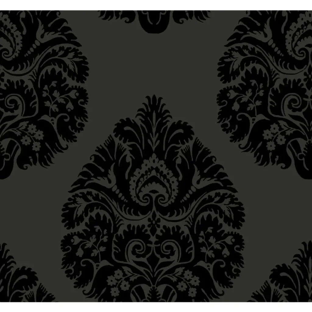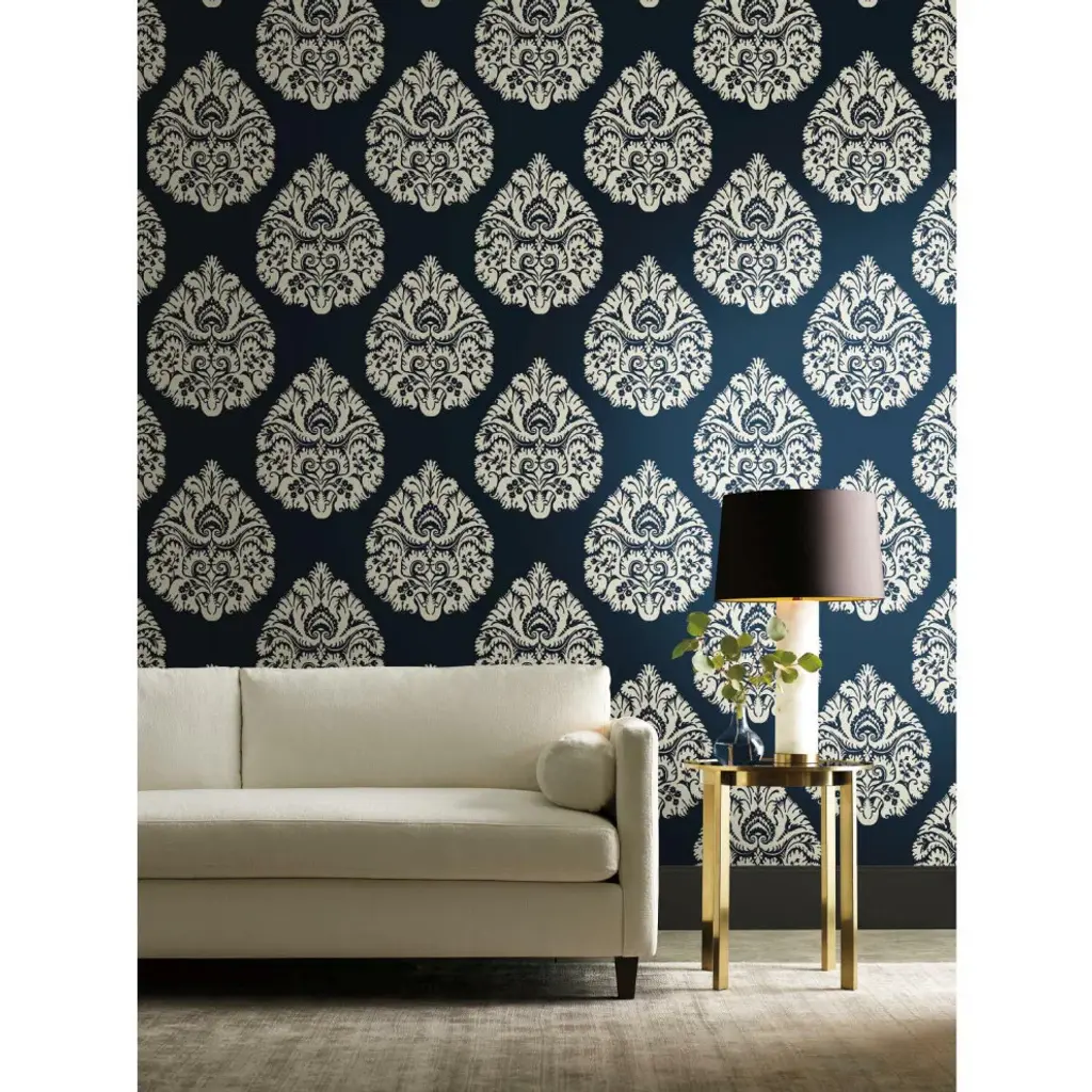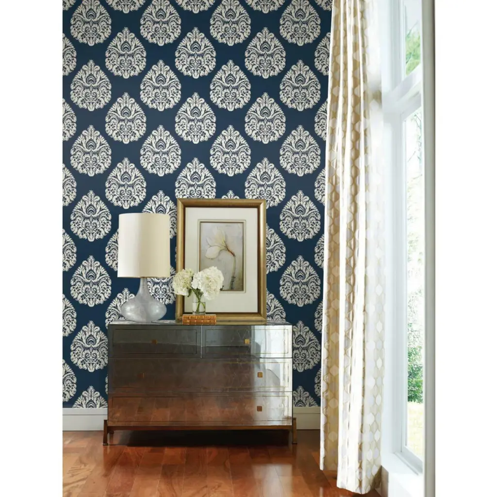 Pattern Teardrop Damask is a floral acanthus leaf medallion silhouette reimagined for modern decor. This Teardrop Damask Wallpaper measures approximately 27 inches wide by 27 feet long, covering About 60.8 square feet per roll. Pattern Teardrop Damask reimagines the classic damask medallion in a clean, modern silhouette highlighted against a field of design inspired color. Unpasted non woven material; 25.25-in repeat, straight match; Washable and strippable; 27-in by 27-ft long roll; Covers about 60.8 square feet