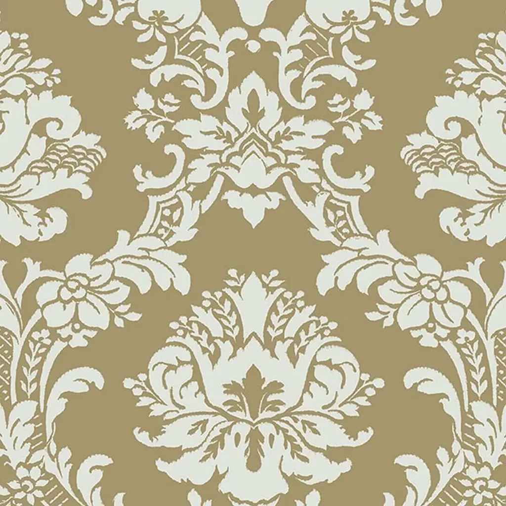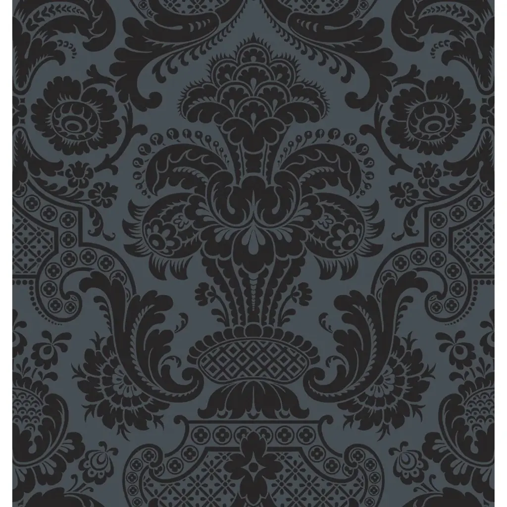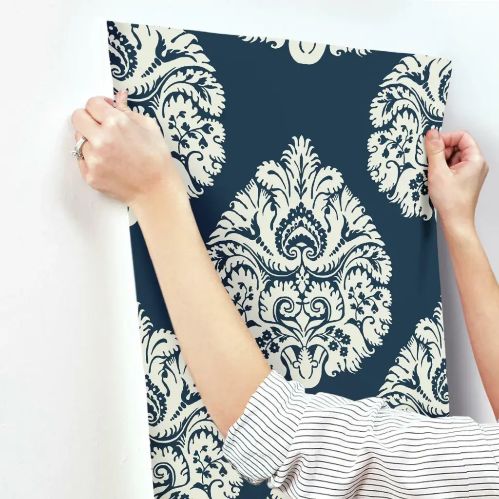 Pattern Teardrop Damask is a floral acanthus leaf medallion silhouette reimagined for modern decor. This Teardrop Damask Wallpaper measures approximately 27 inches wide by 27 feet long, covering About 60.8 square feet per roll. Pattern Teardrop Damask reimagines the classic damask medallion in a clean, modern silhouette highlighted against a field of design inspired color. Unpasted non woven material; 25.25-in repeat, straight match; Washable and strippable; 27-in by 27-ft long roll; Covers about 60.8 square feet