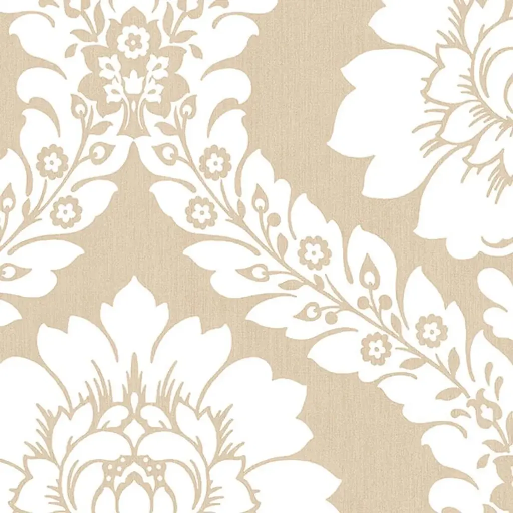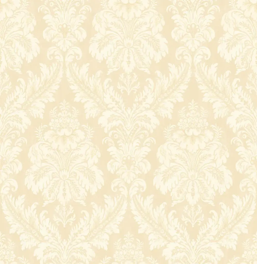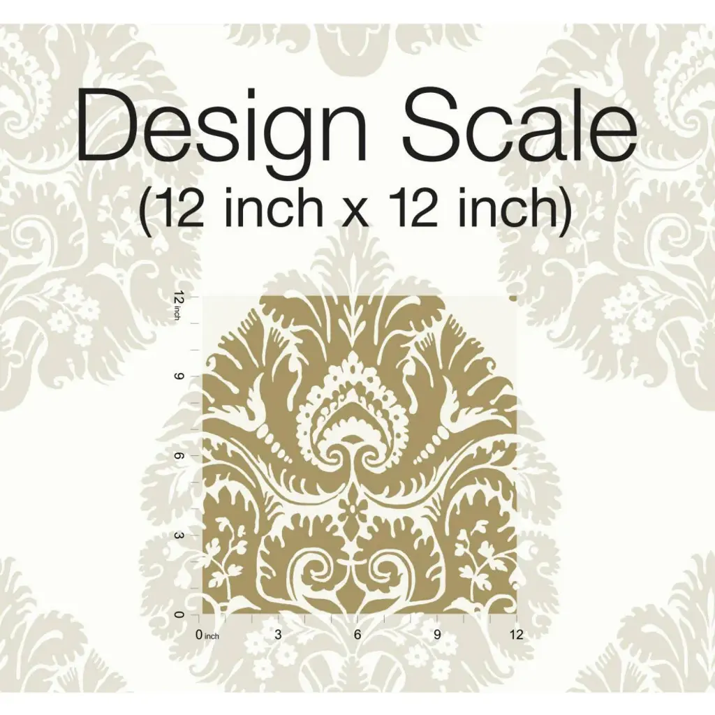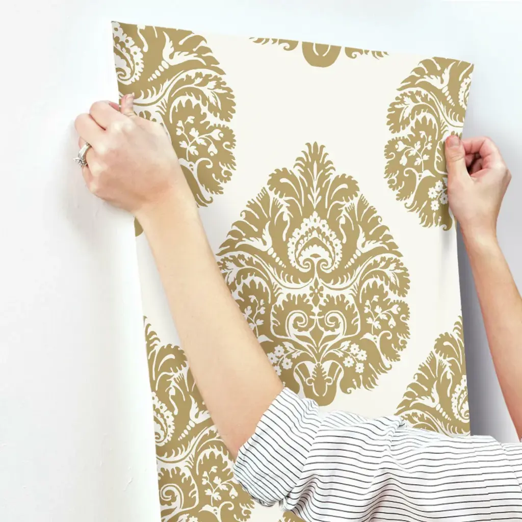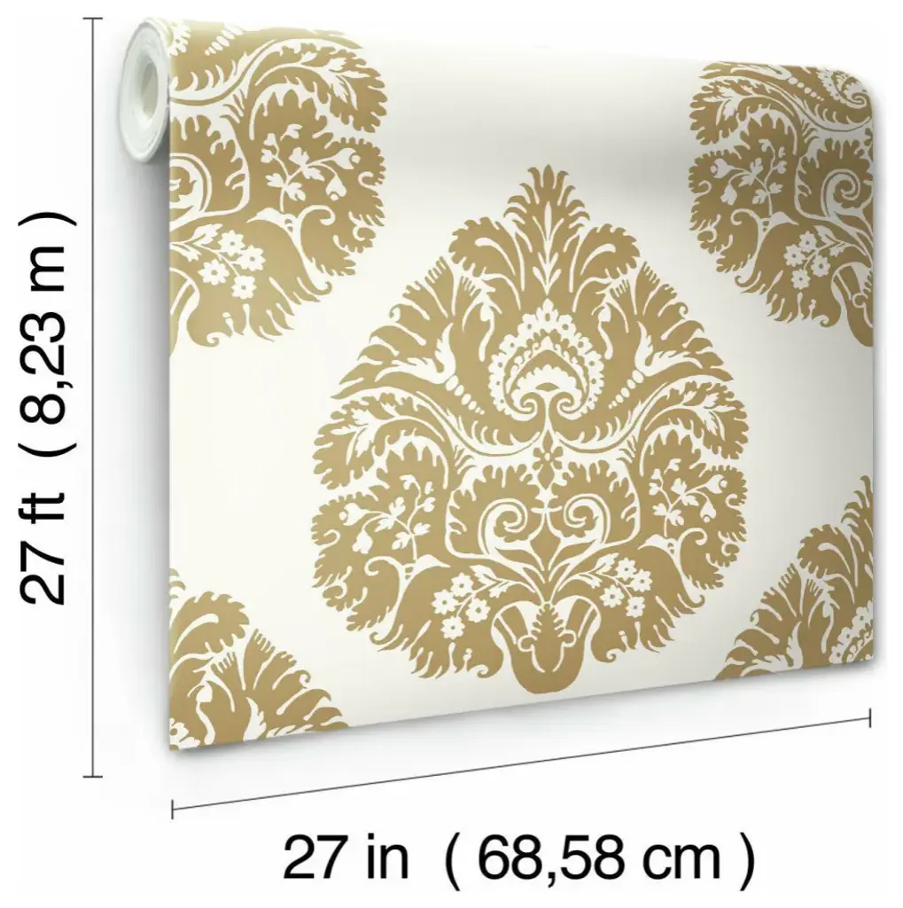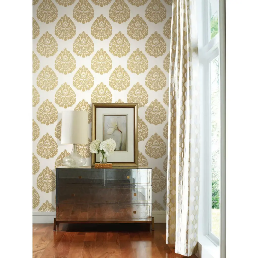 Pattern Teardrop Damask is a floral acanthus leaf medallion silhouette reimagined for modern decor. This Teardrop Damask Wallpaper measures approximately 27 inches wide by 27 feet long, covering About 60.8 square feet per roll. Pattern Teardrop Damask reimagines the classic damask medallion in a clean, modern silhouette highlighted against a field of design inspired color. Unpasted non woven material; 25.25-in repeat, straight match; Washable and strippable; 27-in by 27-ft long roll; Covers about 60.8 square feet