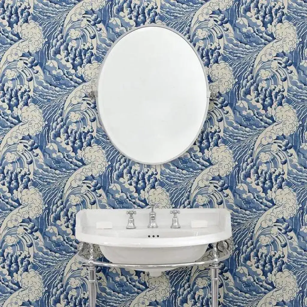 Redrawn and hand painted by Linwood's creative team, this stylish, tonal abstract wallpaper with its dramatic, undulating waves takes its inspiration from an archive design discovered in Paris. Shown in bold Indigo. Pattern Repeat (inches): 17.99