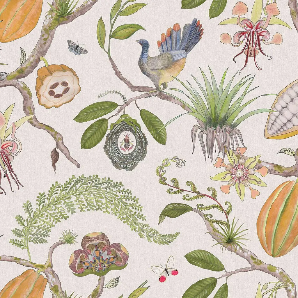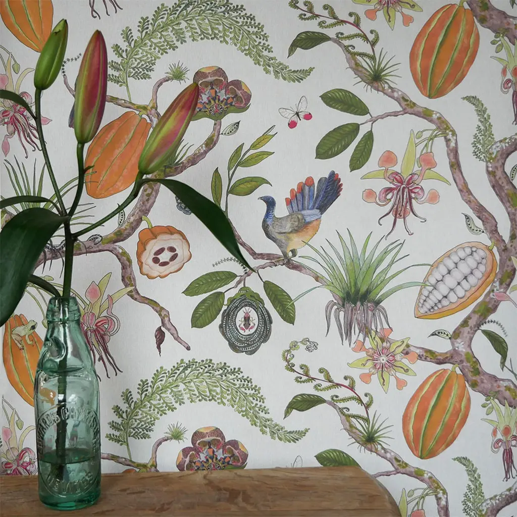 Collection: Theobroma Tree of LifeProduct Code: 55CRoll dimensions: 70cm x 10m (27.6in x 10.9yards)Area: 7sq.m (8.4 sq.yards)Pattern repeat: 46.7cm (18.4in) Half DropColourways: Gold on FlaxWallpaper: The designs are printed on Uncoated Non-woven 147gsm. All colourways are also available on Coated Non-woven 147gsm. The uncoated wallpaper has a matt finish and vibrant but gentle, muted colours. The Coated wallpaper has a slight shine, is more wipeable and has deeper colours.Fire rating: Fire certified for both Europe and the USA. Classified to BS En 13501-1-1:2002, class B, s1, d0This chocolate-lovers design was created as a collaboration with iconic American kitchen and food brand Williams Sonoma. My goal for this collaboration with Williams Sonoma was to depict the complex web of life surrounding the crop that gives us chocolate, Theobroma cacao. No species exists in isolation and the “food of the gods” is grown best in natural agroforestry systems, where diverse trees provide shade and fallen leaves create microhabitats, enabling a great multitude of species to thrive.The design celebrates the Cocoa & Forests Initiative which is all about this approach: agroforestry, environmental stewardship and the prevention of deforestation.The many details in this design together signify the web of life in which cacao can thrive. From tiny flowers themselves to the delicately-patterned red cracker butterfly flits in a shaft of sunlight, observed by its main predator, a small but fierce bird called the rufous-tailed jacamar.Elsewhere you can find the cocoa pods with their variable colours, the leaves in all stages including fallen on the forest floor, and fictional flowers as symbolic representation of the pollinators. Many other species fly about the rufous-vented chachalaca, and blushing phantom butterflies. On the forest floor we have the dotted reed frog, ringed caecilian, leaf-footed Coreid bug and the elegant fern, Asplenium cuspidatum. A web of diverse life.This is an eco-friendly fine gicleé digitally-printed “real” wallpaper. It is printed in the UK on a natural non-woven cellulose-based substrate made from recycled materials, recycled polyester (PET) fibre and recycled wood pulp. The production process is solvent free with minimal waste and energy inputs.