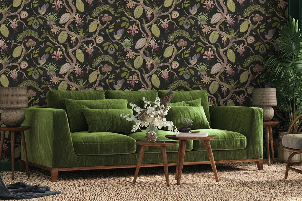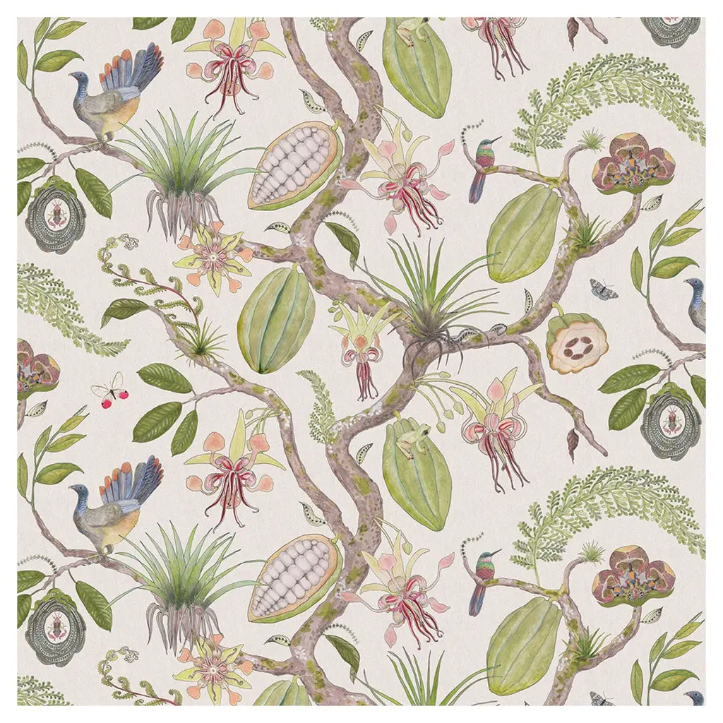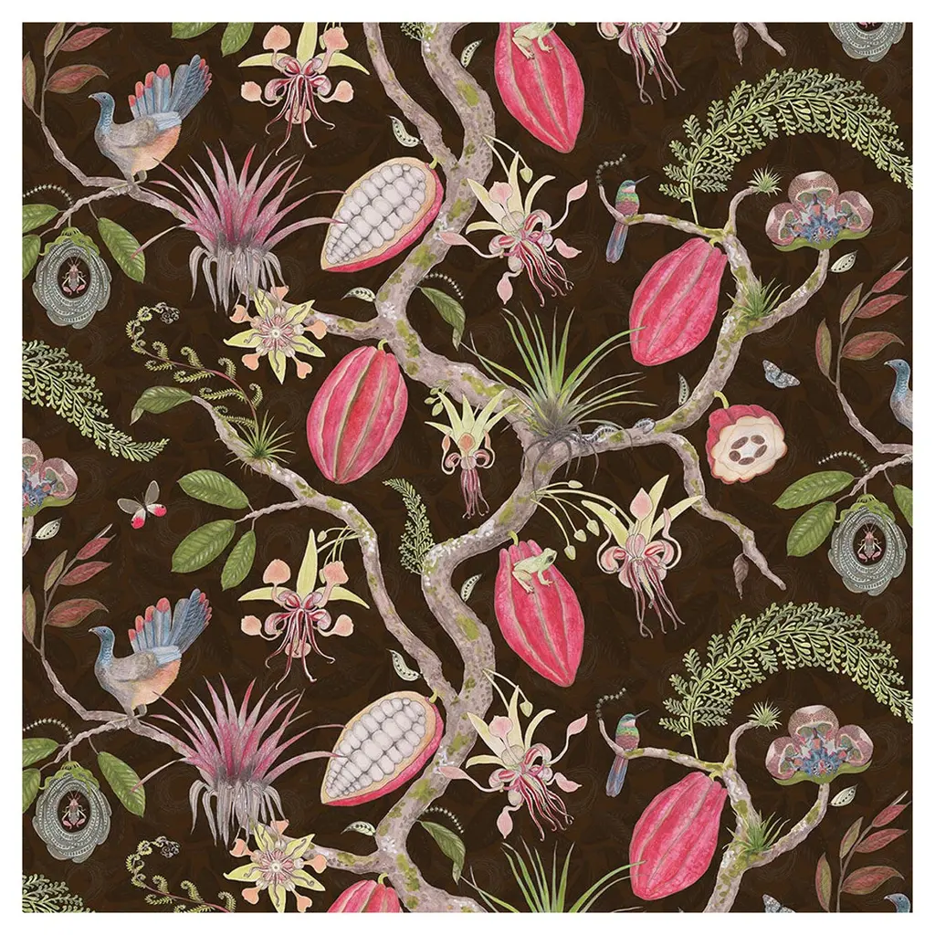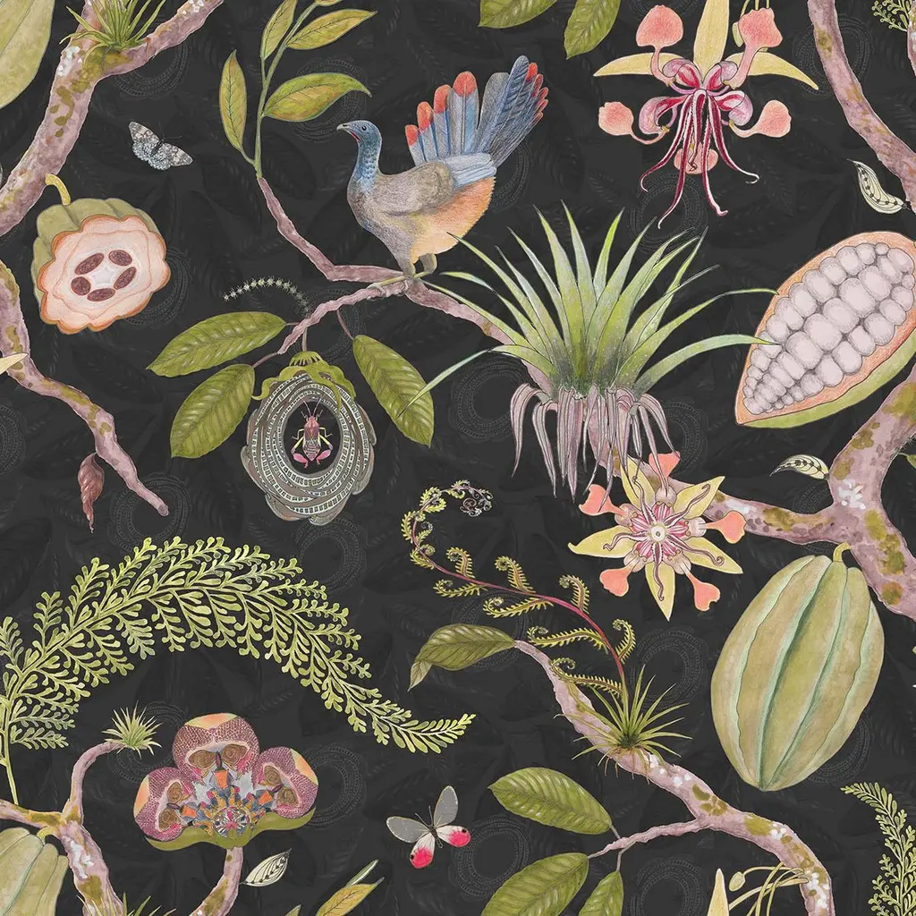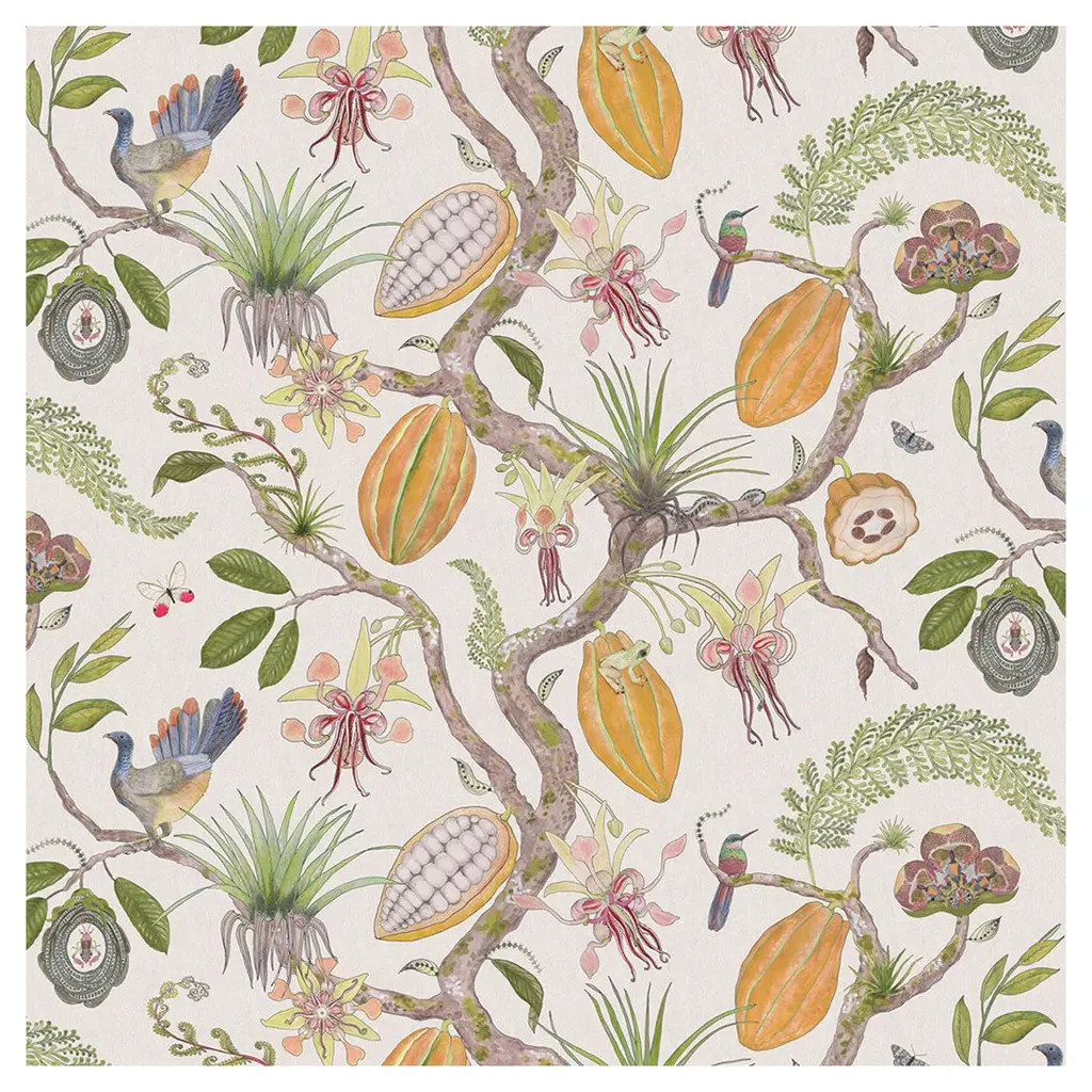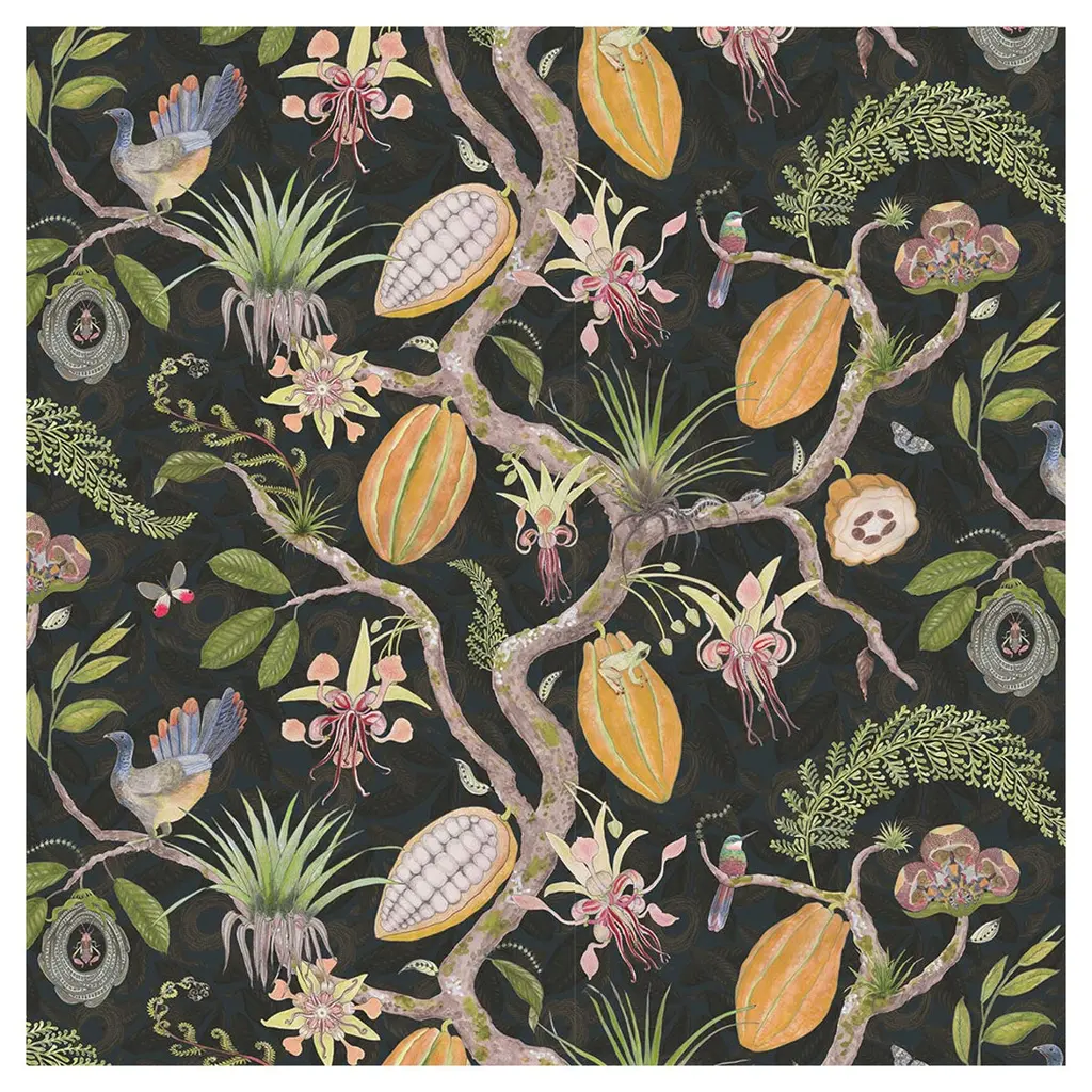 Collection: Theobroma Tree of LifeProduct Code: 55FRoll dimensions: 70cm x 10m (27.6in x 10.9yards)Area: 7sq.m (8.4 sq.yards)Pattern repeat: 46.7cm (18.4in) Half DropColourways: Leaf on SlateWallpaper: The designs are printed on Uncoated Non-woven 147gsm. All colourways are also available on Coated Non-woven 147gsm. The uncoated wallpaper has a matt finish and vibrant but gentle, muted colours. The Coated wallpaper has a slight shine, is more wipeable and has deeper colours.Fire rating: Fire certified for both Europe and the USA. Classified to BS En 13501-1-1:2002, class B, s1, d0This chocolate-lovers design was created as a collaboration with iconic American kitchen and food brand Williams Sonoma. My goal for this collaboration with Williams Sonoma was to depict the complex web of life surrounding the crop that gives us chocolate, Theobroma cacao. No species exists in isolation and the “food of the gods” is grown best in natural agroforestry systems, where diverse trees provide shade and fallen leaves create microhabitats, enabling a great multitude of species to thrive.The design celebrates the Cocoa & Forests Initiative which is all about this approach: agroforestry, environmental stewardship and the prevention of deforestation.The many details in this design together signify the web of life in which cacao can thrive. From tiny flowers themselves to the delicately-patterned red cracker butterfly flits in a shaft of sunlight, observed by its main predator, a small but fierce bird called the rufous-tailed jacamar.Elsewhere you can find the cocoa pods with their variable colours, the leaves in all stages including fallen on the forest floor, and fictional flowers as symbolic representation of the pollinators. Many other species fly about the rufous-vented chachalaca, and blushing phantom butterflies. On the forest floor we have the dotted reed frog, ringed caecilian, leaf-footed Corrie bug and the elegant fern, Asplenium cuspidatum. A web of diverse life.This is an eco-friendly fine gicleé digitally-printed “real” wallpaper. It is printed in the UK on a natural non-woven cellulose-based substrate made from recycled materials, recycled polyester (PET) fibre and recycled wood pulp. The production process is solvent free with minimal waste and energy inputs.