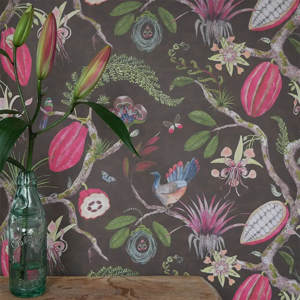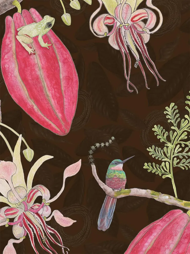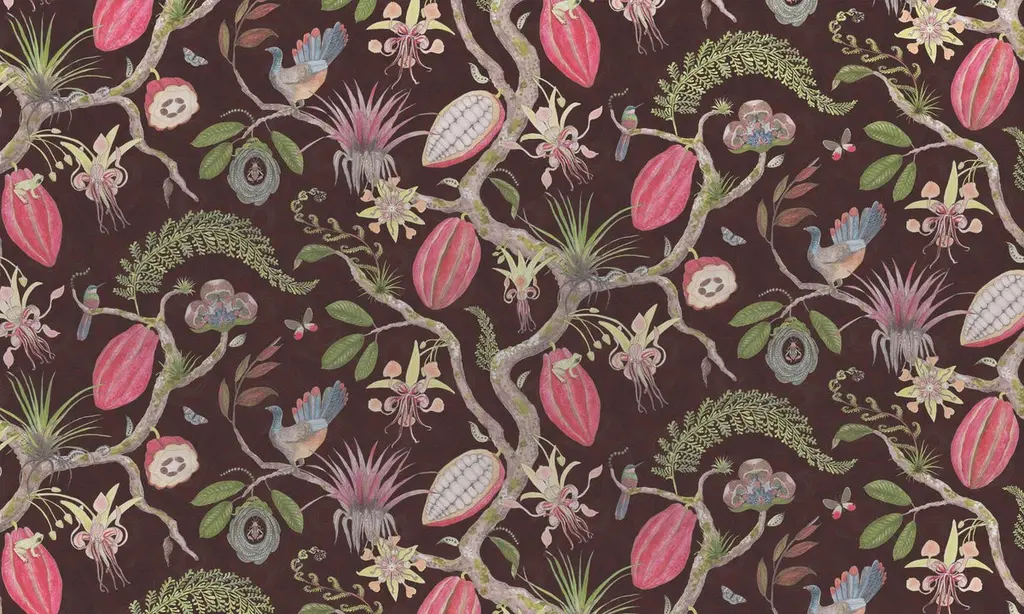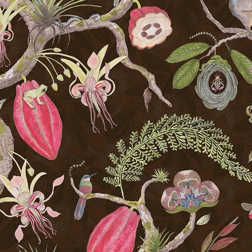Collection: Theobroma Tree of LifeProduct Code: 55BRoll dimensions: 70cm x 10m (27.6in x 10.9yards)Area: 7sq.m (8.4 sq.yards)Pattern repeat: 46.7cm (18.4in) Half DropColourways: Ruby on CacaoWallpaper: The designs are printed on Uncoated Non-woven 147gsm. All colourways are also available on Coated Non-woven 147gsm. The uncoated wallpaper has a matt finish and vibrant but gentle, muted colours. The Coated wallpaper has a slight shine, is more wipeable and has deeper colours.Fire rating: Fire certified for both Europe and the USA. Classified to BS En 13501-1-1:2002, class B, s1, d0This chocolate-lovers design was created as a collaboration with iconic American kitchen and food brand Williams Sonoma. My goal for this collaboration with Williams Sonoma was to depict the complex web of life surrounding the crop that gives us chocolate, Theobroma cacao. No species exists in isolation and the “food of the gods” is grown best in natural agroforestry systems, where diverse trees provide shade and fallen leaves create microhabitats, enabling a great multitude of species to thrive.The design celebrates the Cocoa & Forests Initiative which is all about this approach: agroforestry, environmental stewardship and the prevention of deforestation.The many details in this design together signify the web of life in which cacao can thrive. From tiny flowers themselves to the delicately-patterned red cracker butterfly flits in a shaft of sunlight, observed by its main predator, a small but fierce bird called the rufous-tailed jacamar.Elsewhere you can find the cocoa pods with their variable colours, the leaves in all stages including fallen on the forest floor, and fictional flowers as symbolic representation of the pollinators. Many other species fly about the rufous-vented chachalaca, and blushing phantom butterflies. On the forest floor we have the dotted reed frog, ringed caecilian, leaf-footed Coreid bug and the elegant fern, Asplenium cuspidatum. A web of diverse life.This is an eco-friendly fine gicleé digitally-printed “real” wallpaper. It is printed in the UK on a natural non-woven cellulose-based substrate made from recycled materials, recycled polyester (PET) fibre and recycled wood pulp. The production process is solvent free with minimal waste and energy inputs.