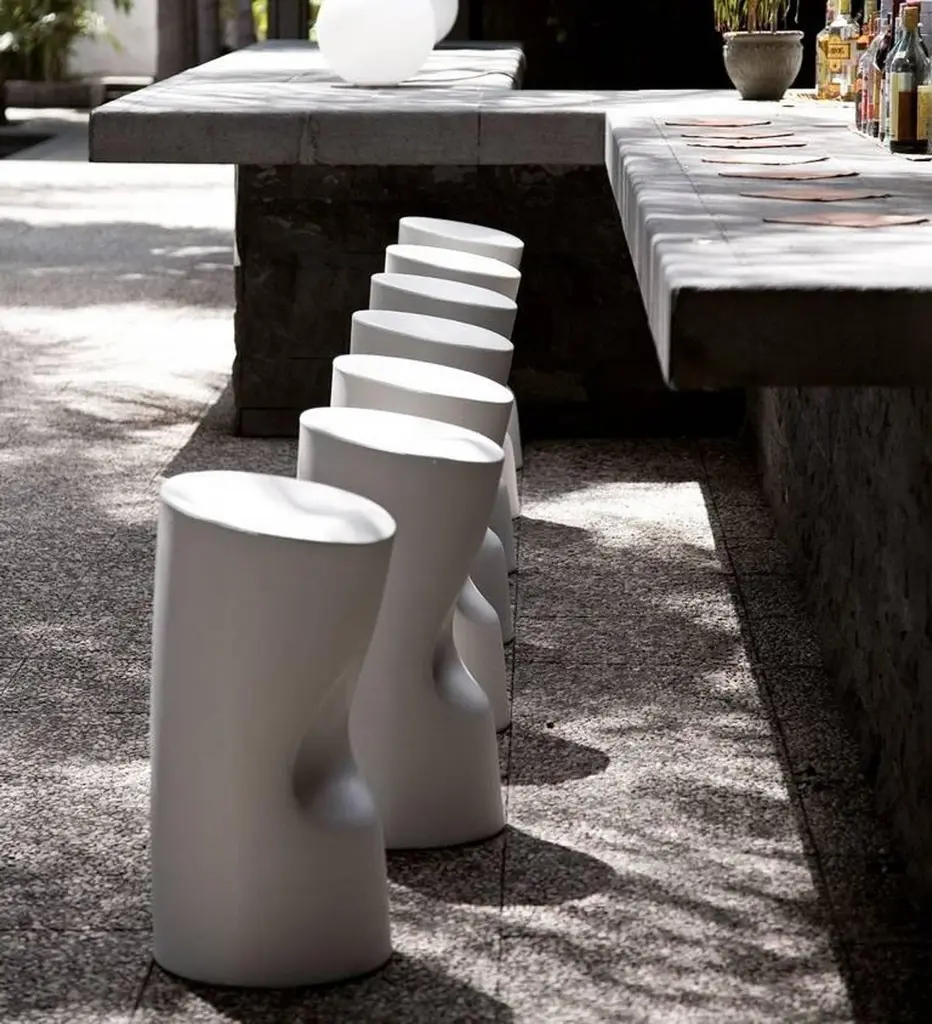 "Tokyo-Pop" is a white or black anthracite polyethylene monobloc iconic stool, matching with tables high 35.4", designed by Tokujin Yoshioka and manufactured by Driade. White version only is available in quick ship.Indoor and outdoor use.DIMENSIONS:D. 15.7", W. 14.3", H. 27.5"Tokyo-Pop collection was Tokujin Yoshioka's debut on the international design scene in 2002. Now he's considered as one of the masters of contemporary design. With his set of sofa, armchair and especially chaise longue and stool he seems to ignore the trivial qualities of rotational plastic molding and turn them into real sculptures featuring unforgettable and unusual forms.TOKUJIN YOSHIOKA, born in Japan in 1967 and winner of many awards, with pieces on display at the MoMA and the Cooper Hewitt in New York, the Victoria & Albert in London and the Vitra Design Museum, trained along with Shiro Kuramata and Issey Miyake, opened his own studio in 2000, and has worked with Japanese and international companies such as Hermès, Toyota, BMW and Swarovski, designing showrooms and installations. As a result of the success of the Honey-pop paper chair in 2001, he began establishing increasingly close links with the world of interior design, developing projects for Driade, Moroso and Kartell, amongst the others. The main feature of his creations is their poetic, light, dreamlike quality. His products, interiors and installations are the result of painstaking, complex research carried out on simple materials, combined with experimental technology. The awards he won include Design Miami, Designer of the Year 2007, the Wallpaper Design Awards 2008 and Elle Decoration International Design Award, Designer of the Year 2009.