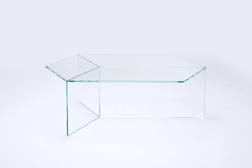 Transparent glass "Isom Oblong" coffee table, Sebastian SchererDimensions:Small 105 x 61 x 35 cmLarge 120 x 69 x 40 cmMaterials: Solid glassDifferent colors and sizes are availableThe Isom tables play with a fascinating optical illusion. The hexagonal glass panel is UV glued with three vertical foot elements whose edges, viewed from a certain angle, convey the perfect isometric drawing of a cube. A special detail is the CNC-ground double mitres and the seamless bonding of the foot elements. The different sizes and variants can be combined very well. The glass tables are available in four colors, each in clear glass and satined.The NEO/Craft label was founded by the Berlin-based designer Sebastian Scherer after he won the Lexus Design Award 2014 for his Iris lamp (2013). The debut collection, which consisted of ten products, was first presented at the IMM cologne in January 2015 in what Wallpaper Magazine described as “one of the most impressive debuts in 2015.” Exhibitions at trade fairs in Milan and London followed this same year. Since then, Sebastian Scherer has worked as a designer and creative director in equal measure. The collection consists of his designs, but these can also undergo further development in the future through the input of other designers. The central element in his developmental process is the continual search for new creative possibilities with classical materials such as aluminum, steel, glass and wood.