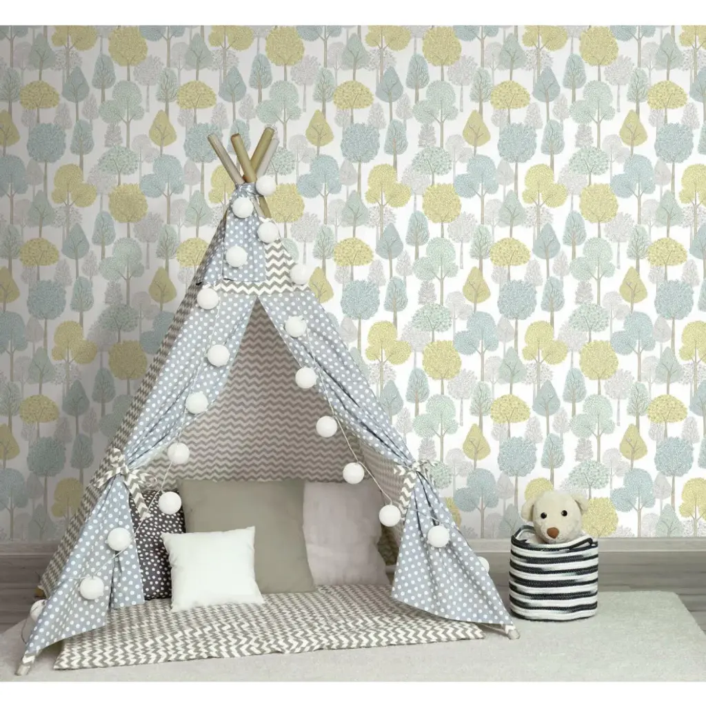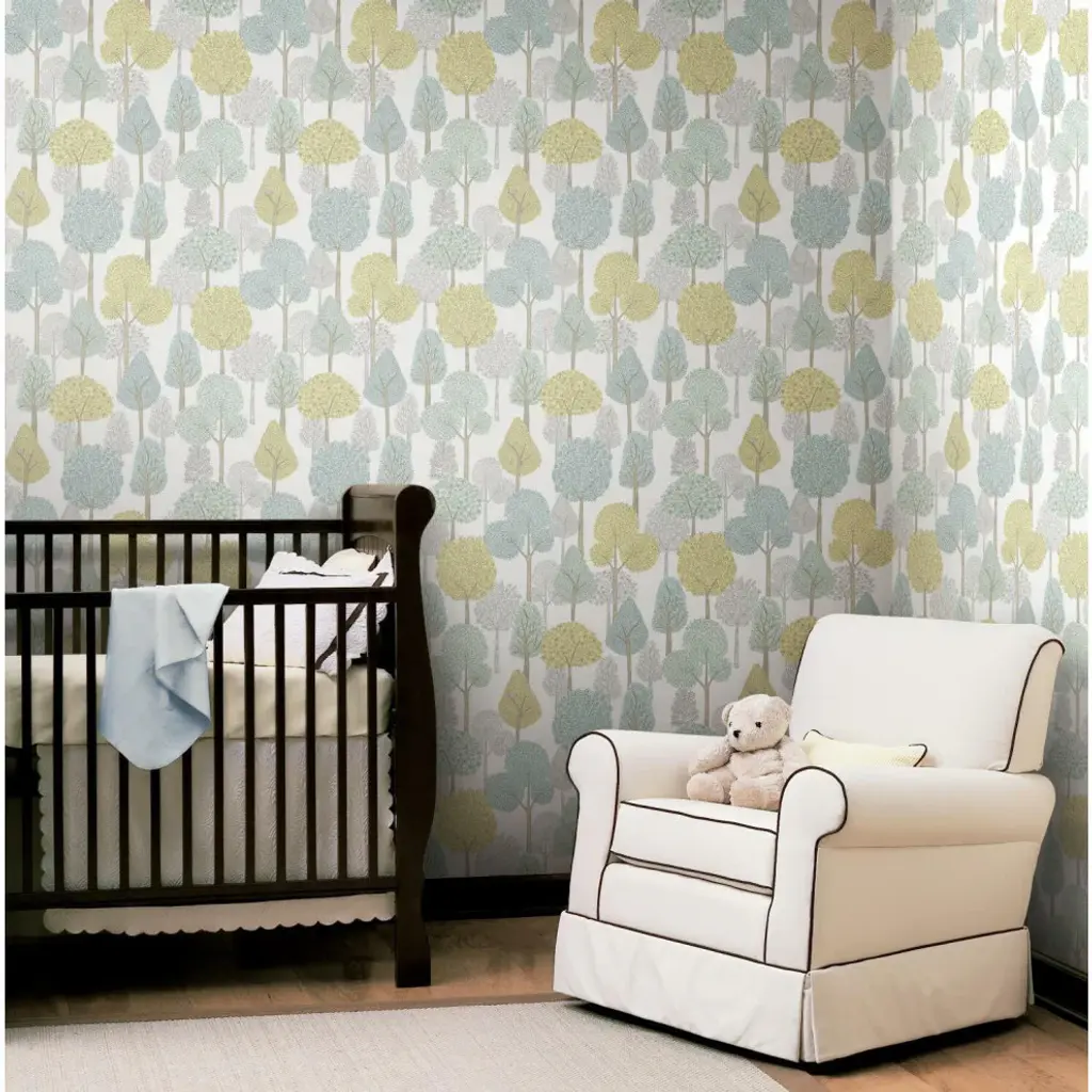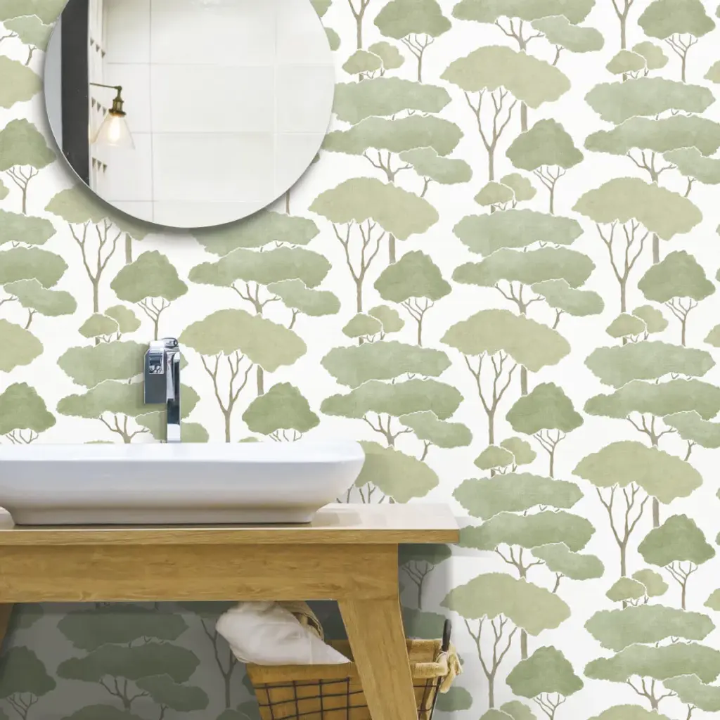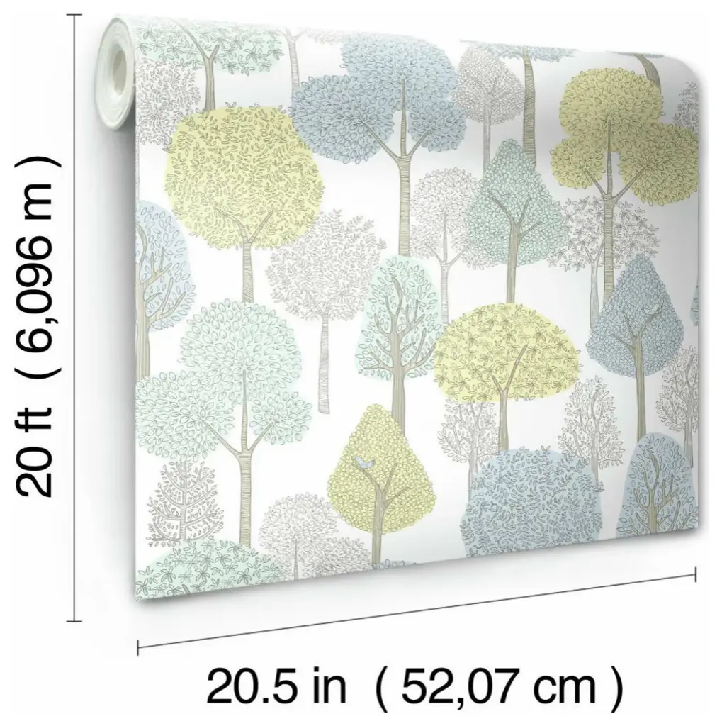 This product is a superior luxury non-woven peel and stick wallpaper, which removes easily in full strips without damage to surfaces. A modern woodland scene creates a mood of enchantment in pattern Treetops. Includes 1 roll - 20.5 in x 20 ft = 34 sq.ft with a straight match and 20.5 in inch repeat.