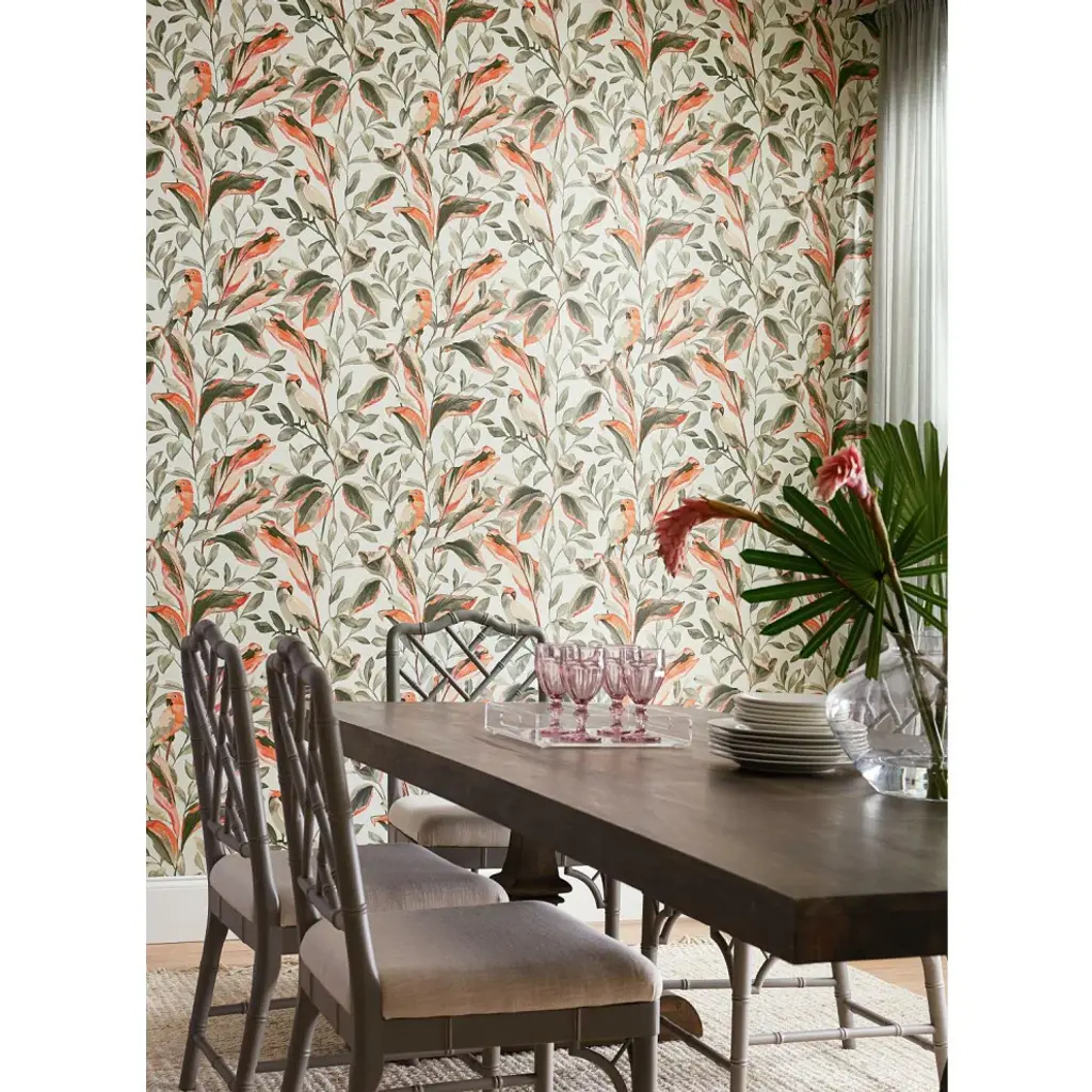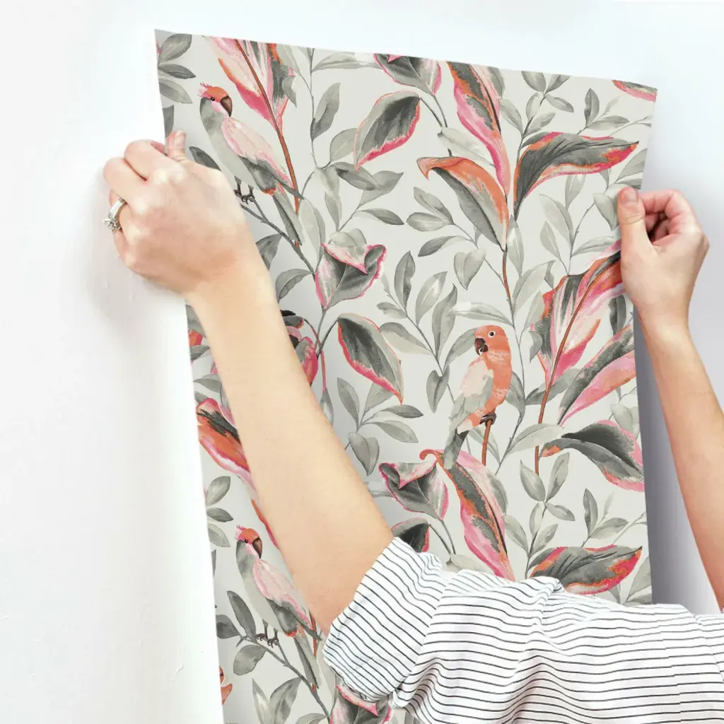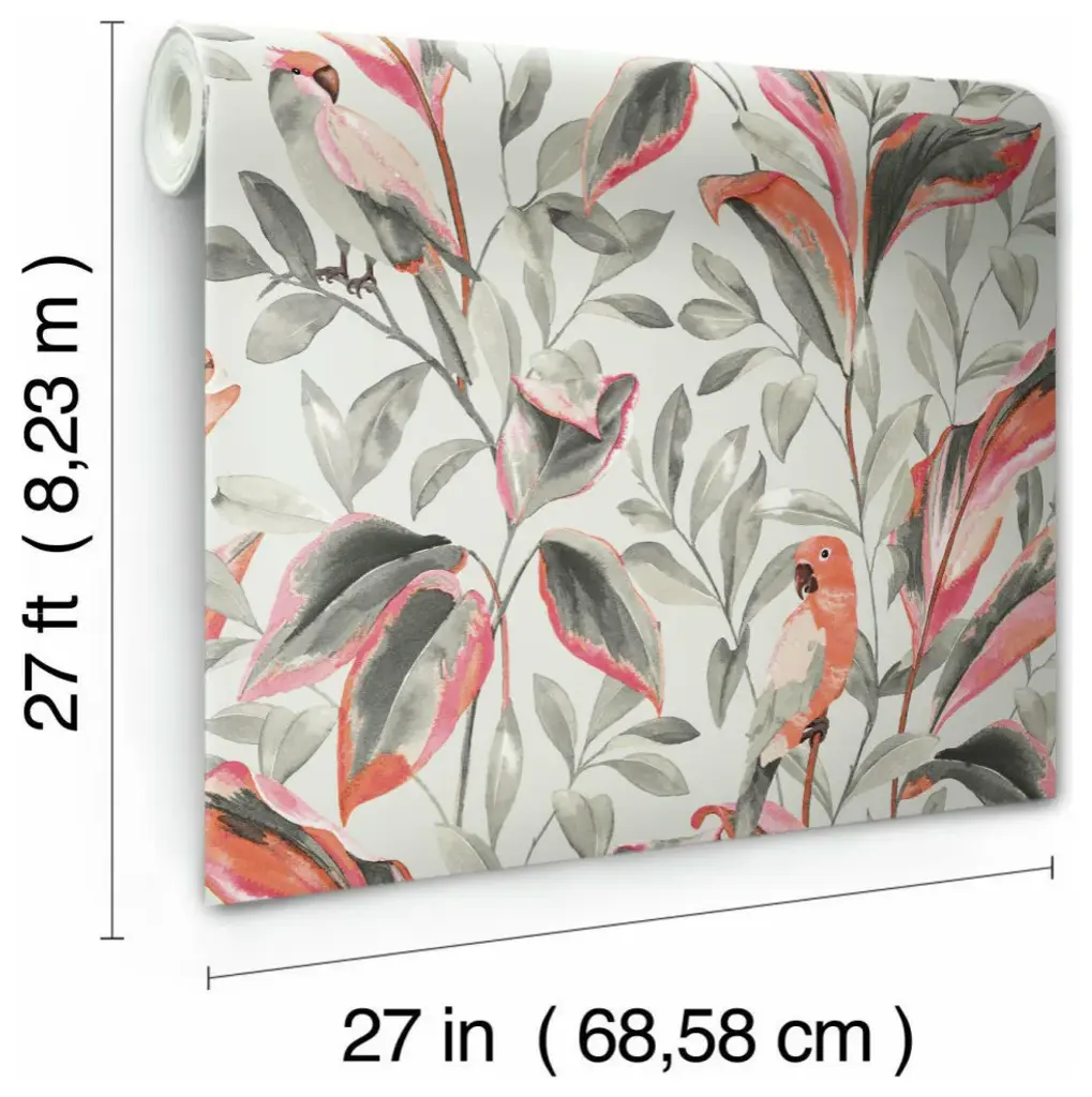 Tropical style is much more than untamed gardens of exotic beauty. It is the embodiment of modern affluent lifestyle and leisure. Manufactured on Sure Strip, a unique high performance substrate, this ultra-easy removable wallpaper is guaranteed easy to install and easy to remove; simply use water to activate. Pretty parrots rest upon lush, tropic leaves in the colorful watercolor rendering of pattern Tropical Lovebirds. Includes 1 roll - 27 in x 27 ft = 60.75 sq ft with a straight match and 24 in repeat.