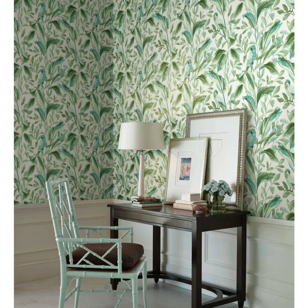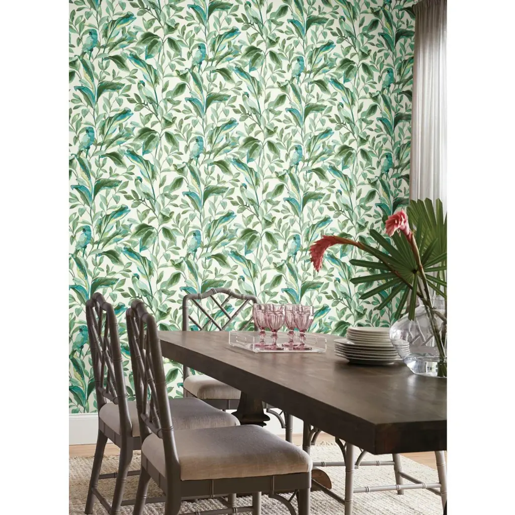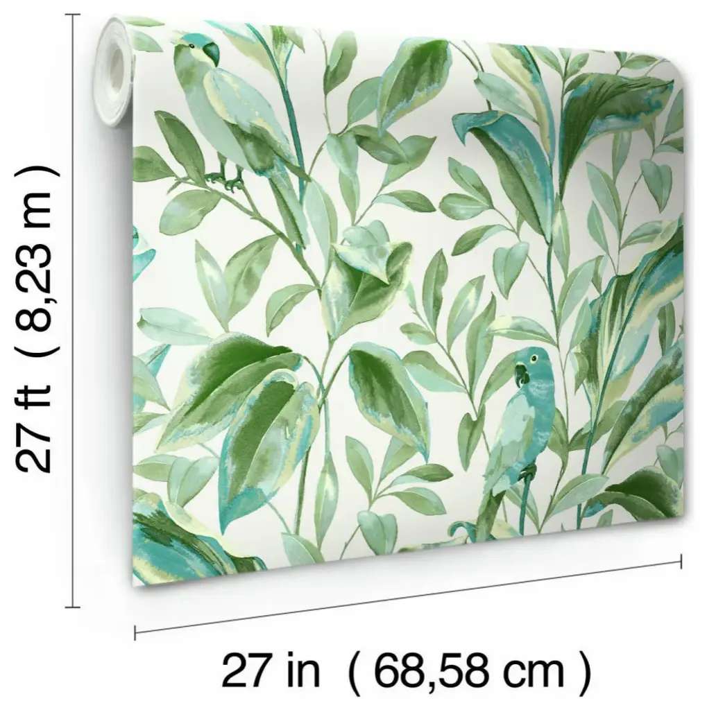 Tropical style is much more than untamed gardens of exotic beauty. It is the embodiment of modern affluent lifestyle and leisure. Manufactured on Sure Strip, a unique high performance substrate, this ultra-easy removable wallpaper is guaranteed easy to install and easy to remove; simply use water to activate. Pretty parrots rest upon lush, tropic leaves in the colorful watercolor rendering of pattern Tropical Lovebirds. Includes 1 roll - 27 in x 27 ft = 60.75 sq ft with a straight match and 24 in repeat.