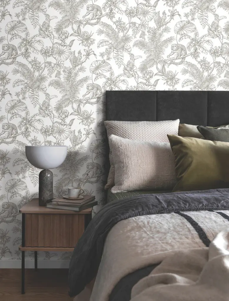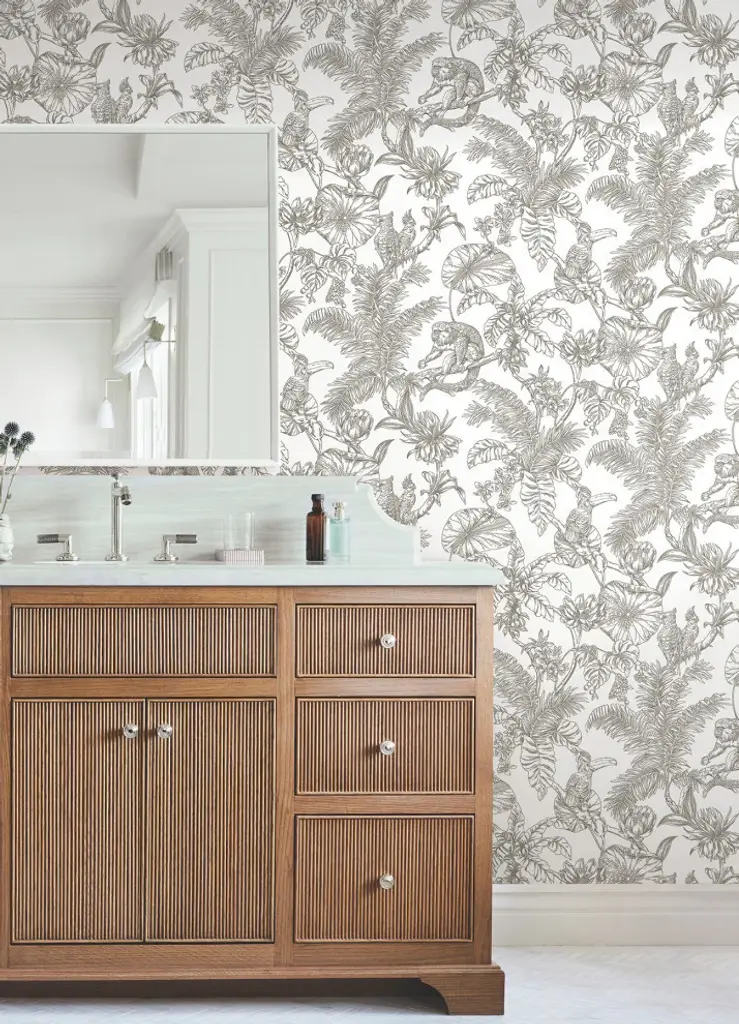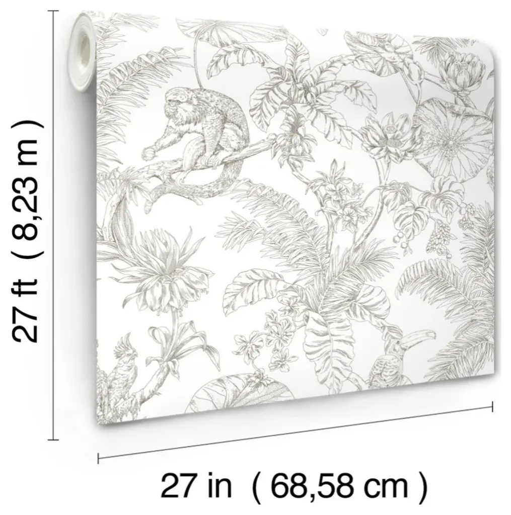 The simple and airy stylings of Tropical Sketch Toile are inked in thin lines of brown against white. This Tropical Sketch Toile Wallpaper measures approximately 27 inches wide by 27 feet long, measuring approximately 60.8 square feet per roll. The quintessential design for timeless romance, toile traces its origins to 18th century fabrics. This celebrated motif is explored with a range of classical reproductions and modern reimaginings. Unpasted non woven material; 25.25-in repeat, drop match; Washable and strippable; 27-in by 27-ft long roll; Covers about 60.8 square feet