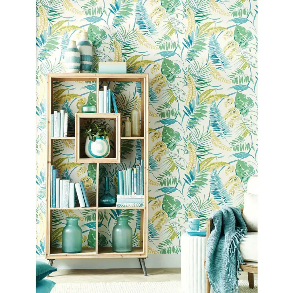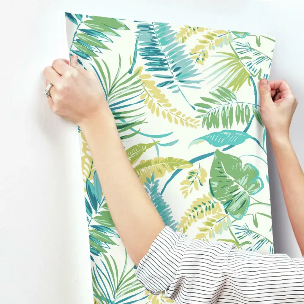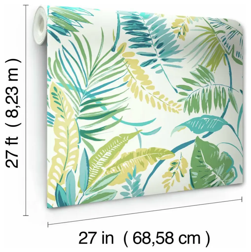 Tropical style is much more than untamed gardens of exotic beauty. It is the embodiment of modern affluent lifestyle and leisure. Manufactured on Sure Strip, a unique high performance substrate, this ultra-easy removable wallpaper is guaranteed easy to install and easy to remove; simply use water to activate. The colorful brushstrokes and palm fronds of pattern Tropical Toss bring a fresh new feeling to these whimsical jungle leaves. Includes 1 roll - 27 in x 27 ft = 60.75 sq ft with a straight match and 25.25 in repeat.