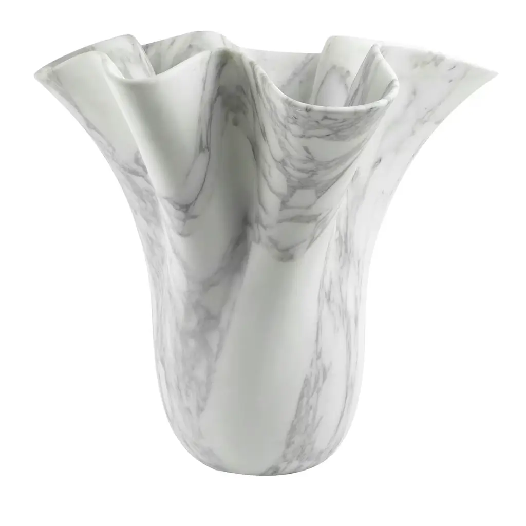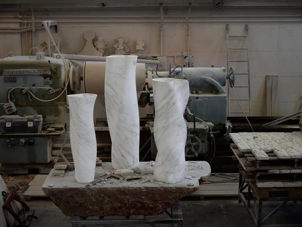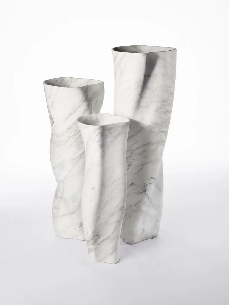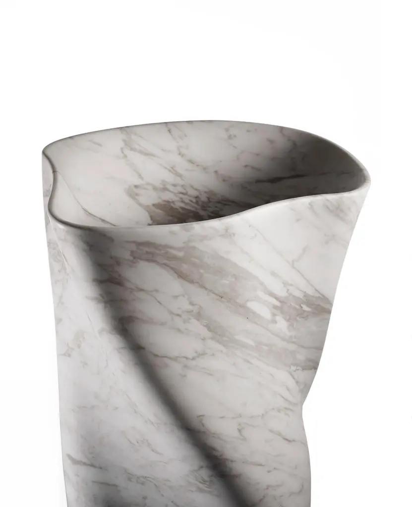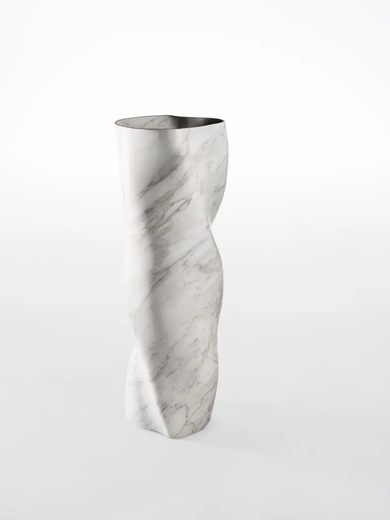 Vase III by Jonathan Hansen12 Edition + 1 APDimensions: 38.4 x 37 x 122 cmMaterials: Calacatta marbleSeries I Captum Biomorfe is a group of nine sculpture works created by New York artist Jonathan Hansen. Captum is a seized or captured thing, and biomorfe is the Italian form of biomorph, or life shape. The Series is a sculptural exploration of the concepts of captivity and freedom with the central reference point of second century Roman sculpture of the human body. These idealized human topographies, or morphologies, have been abstracted and mapped across the surfaces of solid marble furniture objects. Over the top of the sculpted morphologies sits a layer of cast transparent industrialized resin. The peaks and valleys of the biomorphic surfaces can be seen in varying degrees of clarity, depending on how light meets the resin or at what angle the pieces are viewed. There is a tension between the biomorphic undulation and the material that captures it. This tension creates a perception of frozen movement a coexistence of captivity and freedom. The tables sit on architectural bronze columns suggesting the externally visible structures that hold fragments of ancient sculpture, which together create a sense of flotation. The three biomorphic vases and lamp are free from the captum and sit in contrast to the furniture pieces. The formal quality of the marble juxtaposes with the personal and intimate quality of the human topography.Jonathan Hansen has been designing and fabricating furniture and objects since 2001. He has created collections for Ralph Rucci, Thom Browne, Baccarat, Samsonite, Lisa Perry, Aerin Lauder, L’Objet, Fortuny, and Peugeot, as well as individual objects for collectors. Jonathan’s work has been featured in Architectural Digest, Vogue, The New York Times, Surface, Harper’s Bazaar, Wallpaper, and Vogue Germany. Born in the United States, Jonathan grew up in Canada, England, and Singapore. He studied eighteenth and nineteenth-century furniture at the North Bennet Street School in Boston. The foundation of this classically focused program and craftsman training continues to inform the contemporary trajectory on which his work is concentrated. Jonathan has partnered with the Milan-based factory owner Antonio Rillosi, whose specialization in high quality fabrication in stone and metal were a natural compliment for the production of the Series, whose point of departure was classical Roman sculpture.