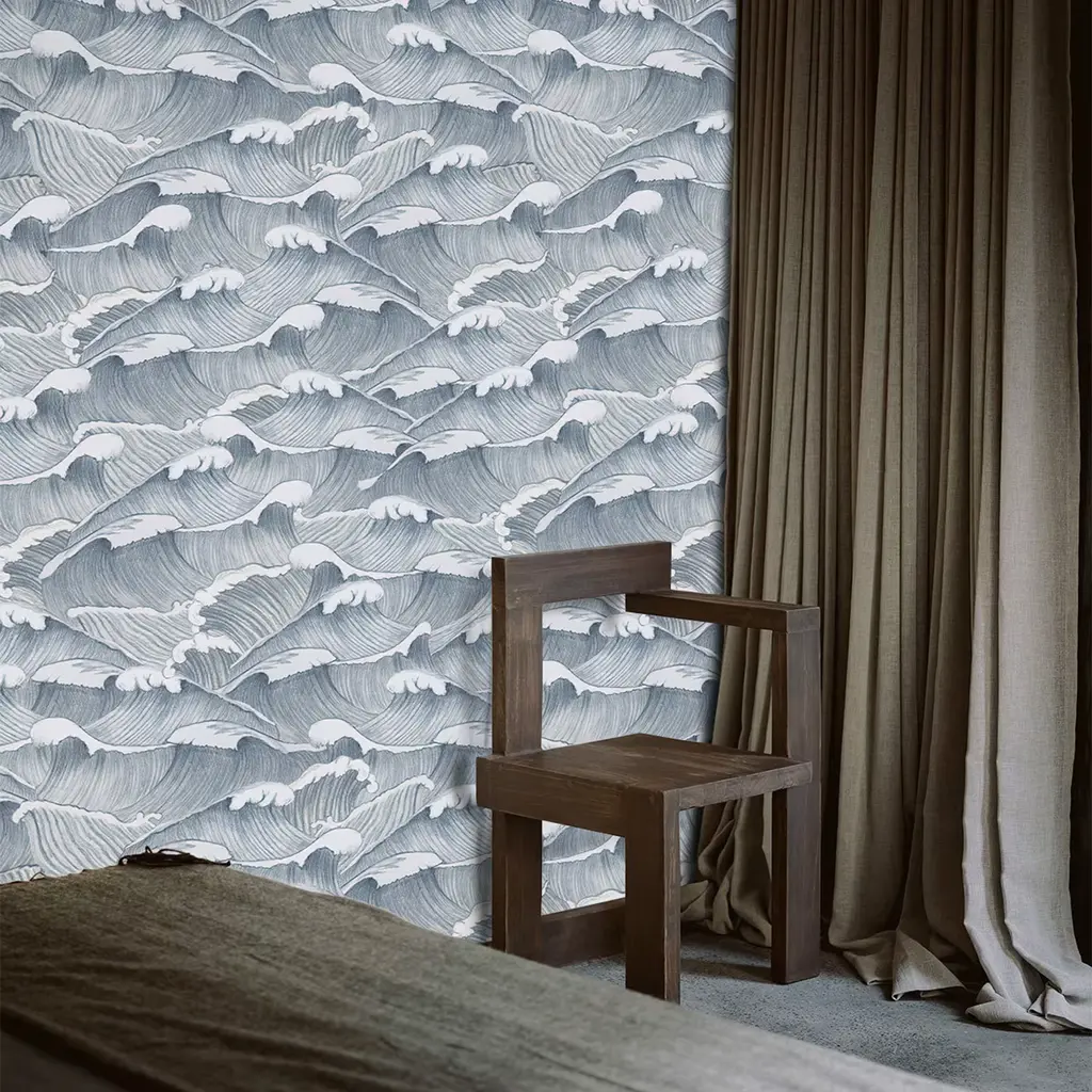 Eco-friendly wallpaper made of 100% ecological paper, painted with vegan water-based inks, and free of chemicals. Designed and printed in Italy, it's easy to apply and remove with hot water. Featuring a playful Asian-inspired wave design in shades of gray, blue, and white, it adds a relaxing, coastal charm, ideal for nurseries, children's rooms, or coastal-themed spaces. Each pack includes 8 sheets. Each sheet measures 27.5x39.4 inches/70x100 cm, covering a total area of 5 MQ.