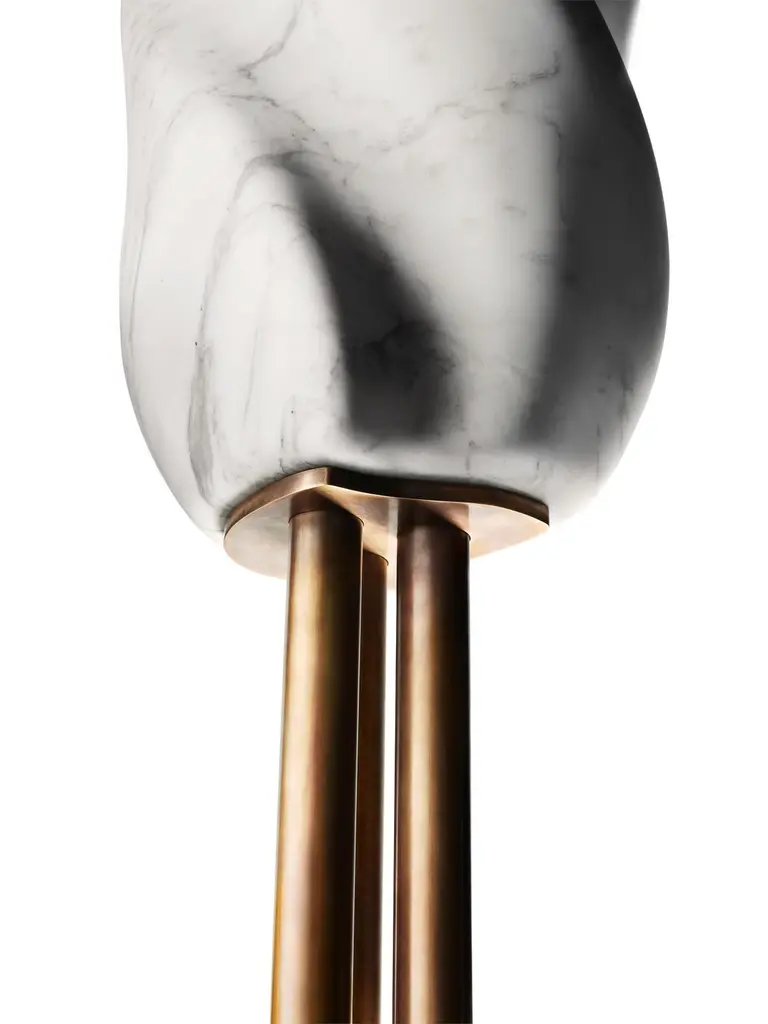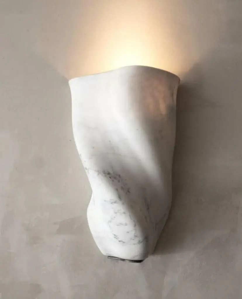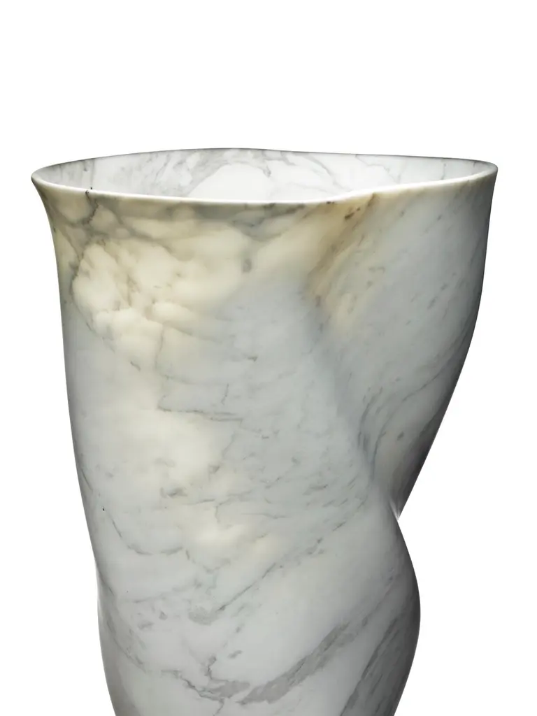 Wall marble sconces by Jonathan Hansen Dimensions: W 32 x D 15 x H 49.5 cmMaterials: Calacatta MarbleSeries I Captum Biomorfe is a group of nine sculpture works created by New York artist Jonathan Hansen. Captum is a seized or captured thing, and biomorfe is the Italian form of biomorph, or life shape. The Series is a sculptural exploration of the concepts of captivity and freedom with the central reference point of second century Roman sculpture of the human body. These idealized human topographies, or morphologies, have been abstracted and mapped across the surfaces of solid marble furniture objects. Over the top of the sculpted morphologies sits a layer of cast transparent industrialized resin. The peaks and valleys of the biomorphic surfaces can be seen in varying degrees of clarity, depending on how light meets the resin or at what angle the pieces are viewed. There is a tension between the biomorphic undulation and the material that captures it. This tension creates a perception of frozen movement . . . a coexistence of captivity and freedom. The tables sit on architectural bronze columns suggesting the externally visible structures that hold fragments of ancient sculpture, which together create a sense of flotation. The three biomorphic vases and lamp are free from the captum and sit in contrast to the furniture pieces. The formal quality of the marble juxtaposes with the personal and intimate quality of the human topography.Jonathan Hansen has been designing and fabricating furniture and objects since 2001. He has created collections for Ralph Rucci, Thom Browne, Baccarat, Samsonite, Lisa Perry, Aerin Lauder, L’Objet, Fortuny, and Peugeot, as well as individual objects for collectors. Jonathan’s work has been featured in Architectural Digest, Vogue, The New York Times, Surface, Harper’s Bazaar, Wallpaper, and Vogue Germany. Born in the United States, Jonathan grew up in Canada, England, and Singapore. He studied eighteenth and nineteenth-century furniture at the North Bennet Street School in Boston. The foundation of this classically focused program and craftsman training continues to inform the contemporary trajectory on which his work is concentrated. Jonathan has partnered with the Milan-based factory owner Antonio Rillosi, whose specialization in high quality fabrication in stone and metal were a natural compliment for the production of the Series, whose point of departure was classical Roman sculpture.