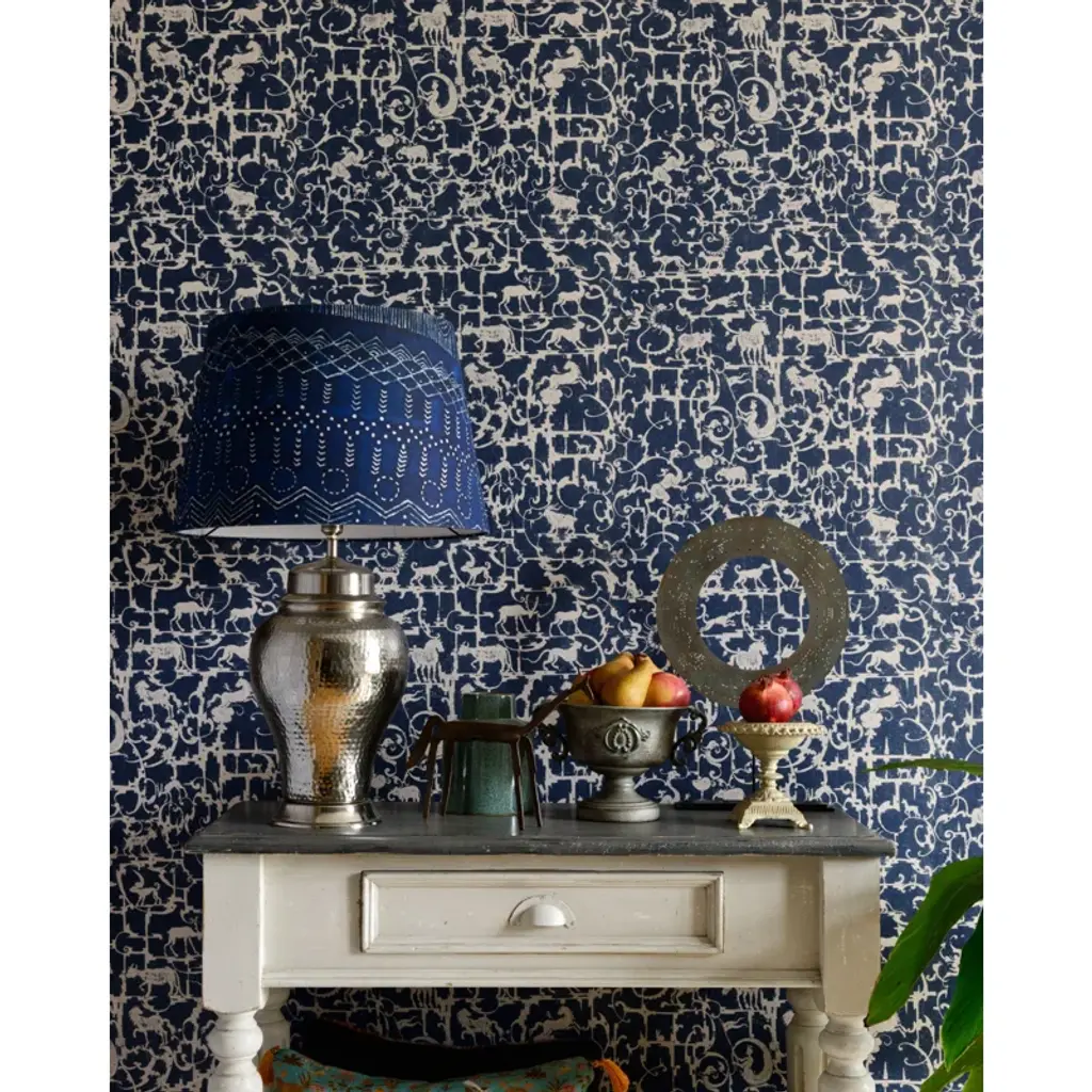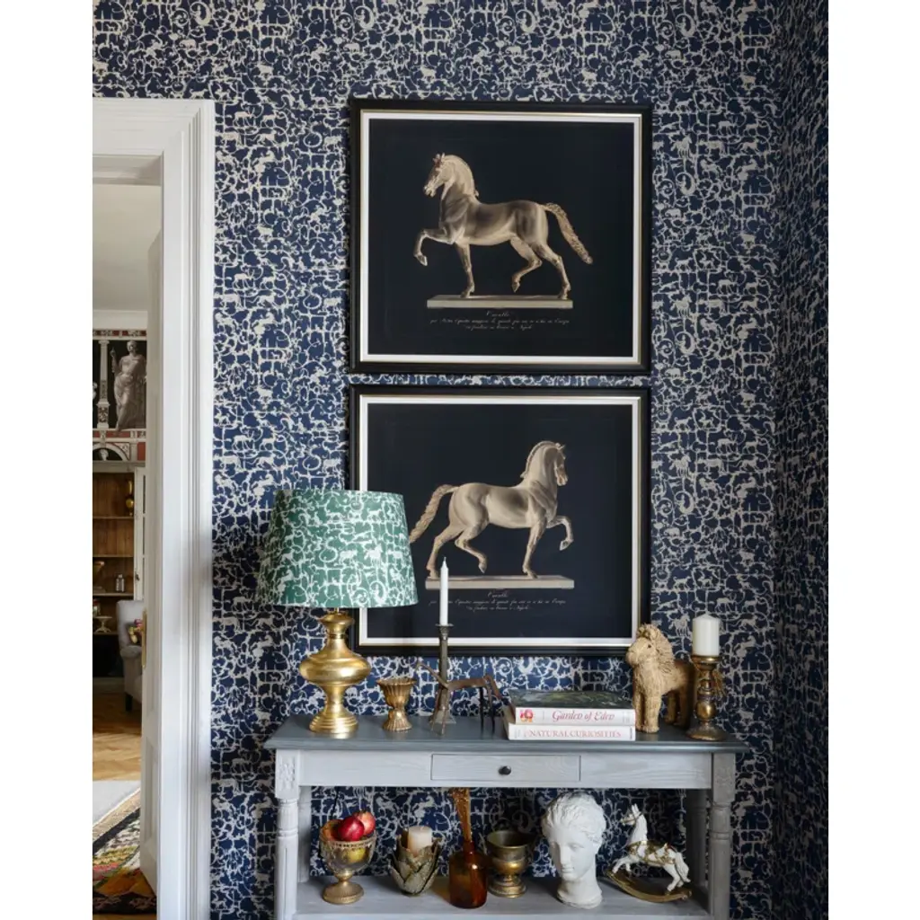 A very old pattern-style design depicting royal hunting somewhere in the Netherlands. A beautiful engraving piece of art transformed into a stylish wallpaper design with beautifully illustrated animals and heraldic elements.