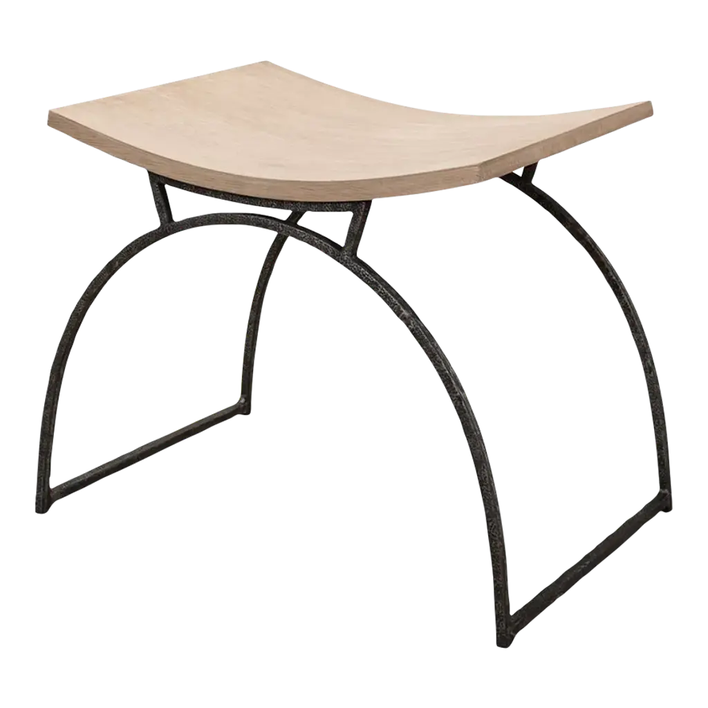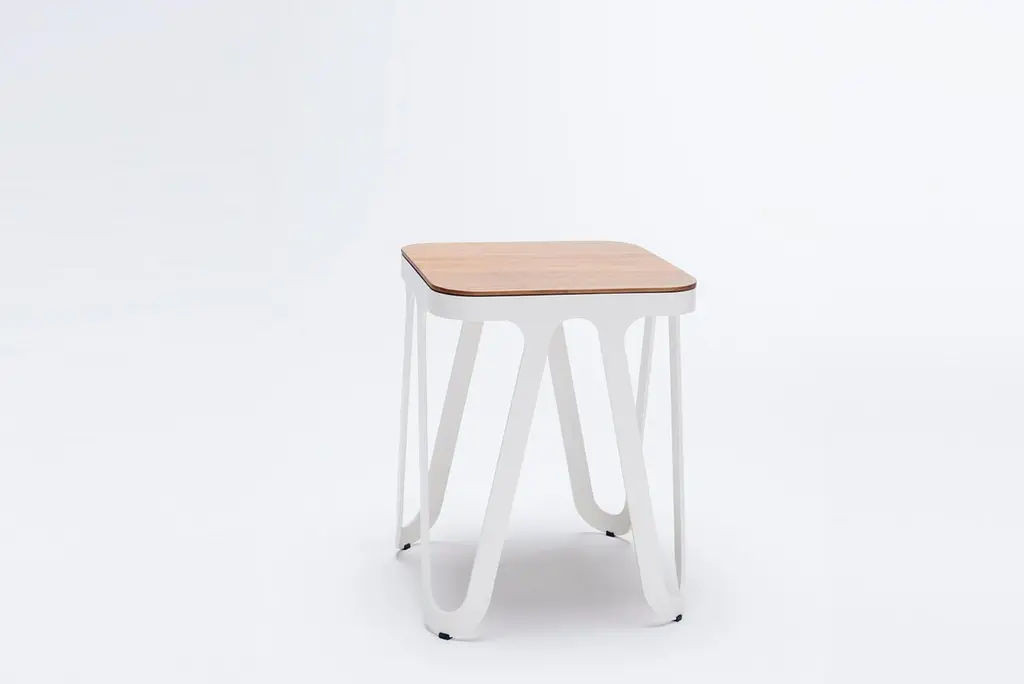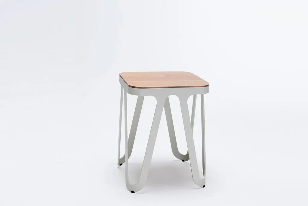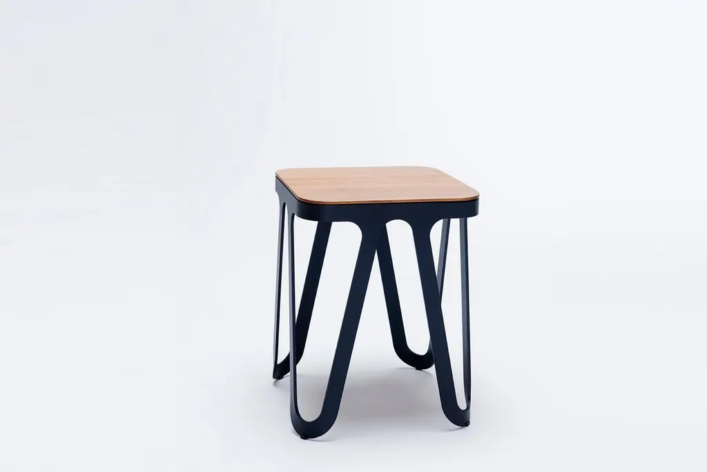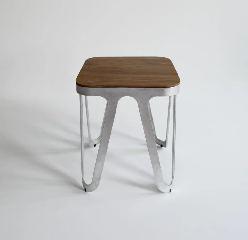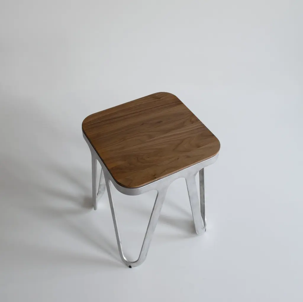 Walnut loop stool by Sebastian Scherer.Dimensions: D38 x W38 x H45 cm.Material: Aluminium, Solid Wood, Walnut.Weight: 4.2 kg.Also available in Aluminium, LOOP STOOL WOOD: solid wood (matt lacquered): black and white stained ash / natural oak / american walnut.The Loop series is characterized by its elegant and futuristic design language. The soft, yet geometric lines have a Scandinavian design reference, but also reminiscent of metal furniture of the Bauhaus era. All furniture in the series follow the same design principle. The only 6 mm thin aluminum frame is cut from a metal sheet and then bent. This gives it its stability and forms its characteristic, loop-like silhouette. This consistent design principle and craftsmanship make the Loop series so unique. Small embedded plastic gliders are discreetly integrated in the frame without disturbing the overall impression.The NEO/CRAFT label was founded by the Berlin-based designer Sebastian Scherer after he won the Lexus Design Award 2014 for his Iris lamp (2013). The debut collection, which consisted of ten products, was first presented at the imm cologne in January 2015 in what Wallpaper Magazine described as “one of the most impressive debuts in 2015.” Exhibitions at trade fairs in Milan and London followed this same year. Since then, Sebastian Scherer has worked as a designer and creative director in equal measure. The collection consists of his designs, but these can also undergo further development in the future through the input of other designers. The central element in his developmental process is the continual search for new creative possibilities with classical materials such as aluminum, steel, glass and wood.