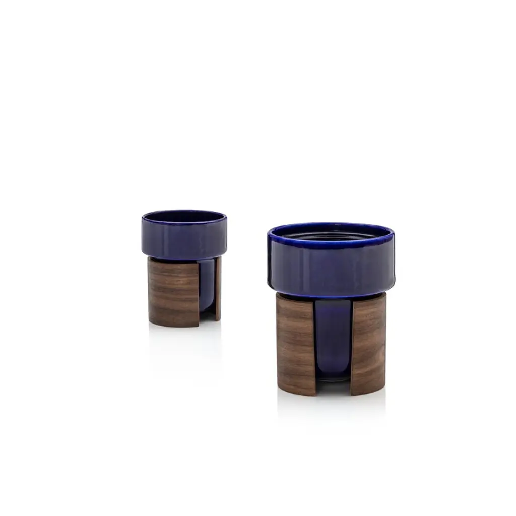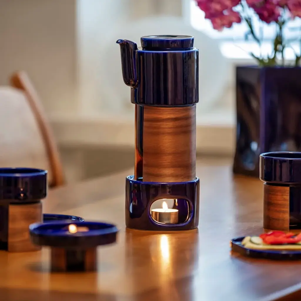 The 8.12 fl oz (2,4 dl) tea and coffee cups from Tonfisk Design's Warm collection enchant with a smooth combination of blue porcelain and walnut. The stackable cups are dishwasher safe, and the removable wooden sleeve can be wiped with a damp cloth and oiled from time to time. The set includes two 8.12 fl oz (2,4 dl) cups. The Warm collection, designed by Brian Keaney from the Finnish ceramics brand Tonfisk Design, pairs porcelain with wood in a simple but stunning way. The Warm products are equipped with an oak or walnut sleeve, which protects hands from heat, insulates the hot beverage and gives the collection its characteristic, warm soul. The Warm tableware has become a modern classic of Finnish design, listed by the Wallpaper magazine in 2006 as one of the best designs of the decade.