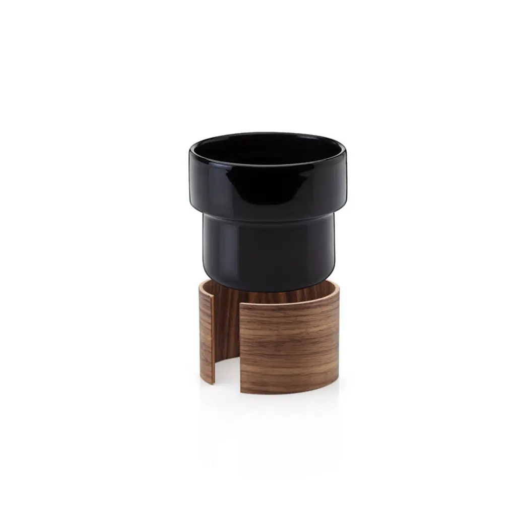 The 13.53 fl oz (4 dl) latte cups from Tonfisk Design's Warm collection enchant with a smooth combination of black porcelain and walnut. The stackable cups are dishwasher safe, and the removable wooden sleeve can be wiped with a damp cloth and oiled from time to time. The Warm collection, designed by Brian Keaney from the Finnish ceramics brand Tonfisk Design, pairs porcelain with wood in a simple but stunning way. The Warm products are equipped with an oak or walnut sleeve, which protects hands from heat, insulates the hot beverage and gives the collection its characteristic, warm soul. The Warm tableware has become a modern classic of Finnish design, listed by the Wallpaper magazine in 2006 as one of the best designs of the decade.