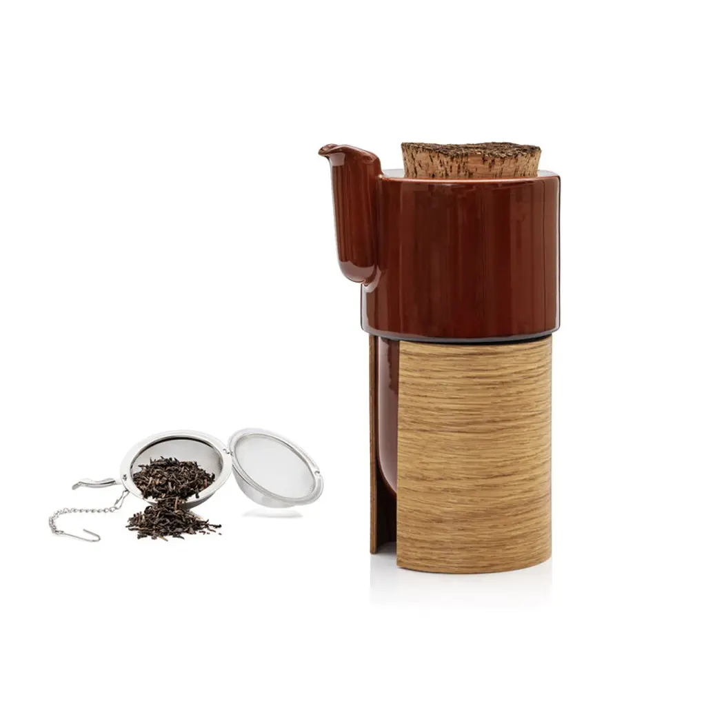 The 20.29 fl oz (6 dl) teapot from Tonfisk Design's Warm collection enchants with a smooth combination of porcelain and oak. The brown porcelain teapot comes with a cork lid, wooden sleeve and metal strainer. The porcelain pot is dishwasher safe, and the removable wooden sleeve can be wiped with a damp cloth and oiled from time to time. The Warm collection, designed by Brian Keaney from the Finnish ceramics brand Tonfisk Design, pairs porcelain with wood in a simple but stunning way. The Warm products are equipped with an oak or walnut sleeve, which protects hands from heat, insulates the hot beverage and gives the collection its characteristic, warm soul. The Warm tableware has become a modern classic of Finnish design, listed by the Wallpaper magazine in 2006 as one of the best designs of the decade
