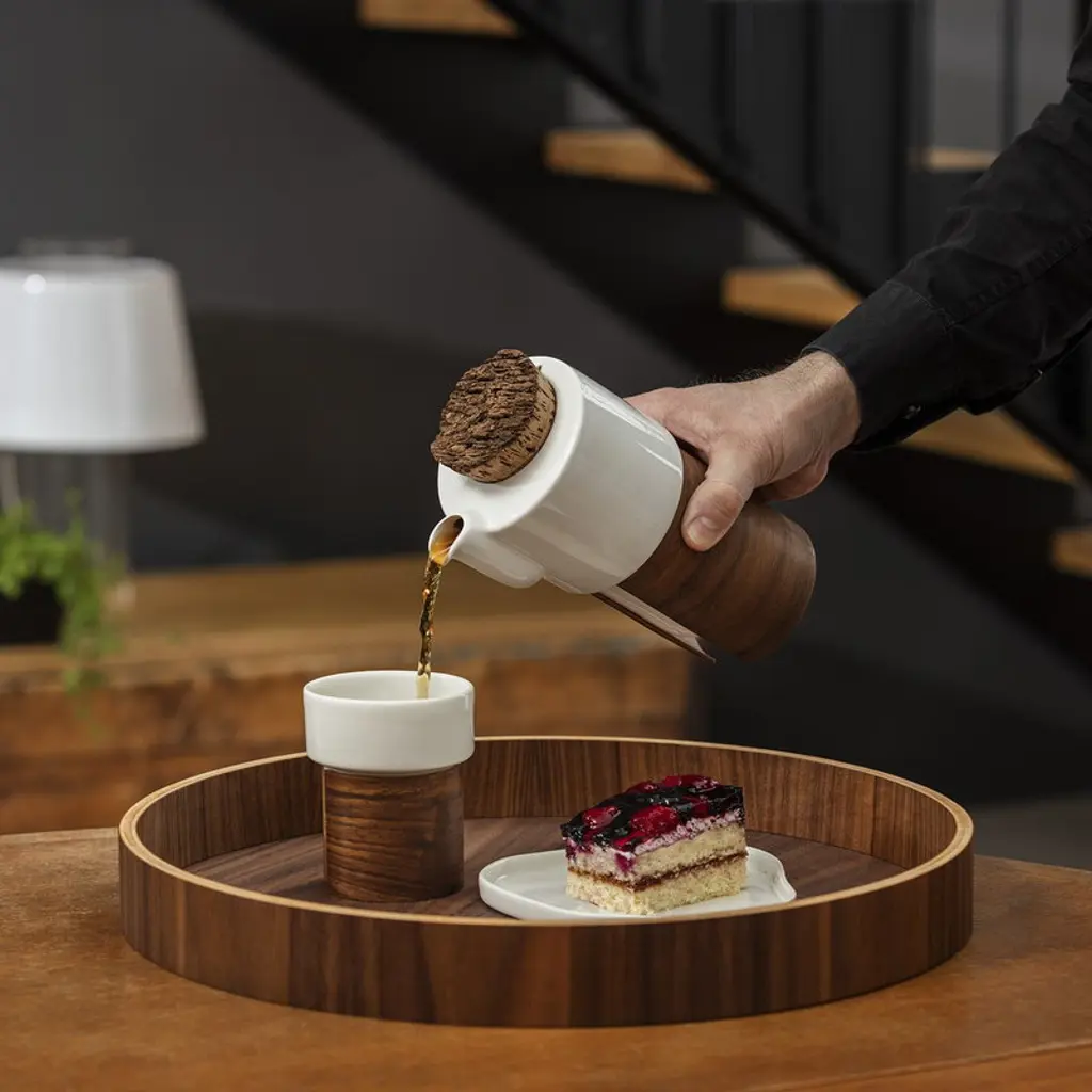The 20.29 fl oz (6 dl) teapot from Tonfisk Design’s Warm collection enchants with a smooth combination of porcelain and wood. The white porcelain teapot comes with a cork stopper, walnut sleeve and metal strainer. The porcelain pot is dishwasher safe, and the removable wooden sleeve can be wiped with a damp cloth and oiled from time to time. The Warm collection, designed by Brian Keaney from the Finnish ceramics brand Tonfisk Design, pairs porcelain with wood in a simple but stunning way. The Warm products are equipped with an oak or walnut sleeve, which protects hands from heat, insulates the hot beverage and gives the collection its characteristic, warm soul. The Warm tableware has become a modern classic of Finnish design, listed by the Wallpaper magazine in 2006 as one of the best designs of the decade.