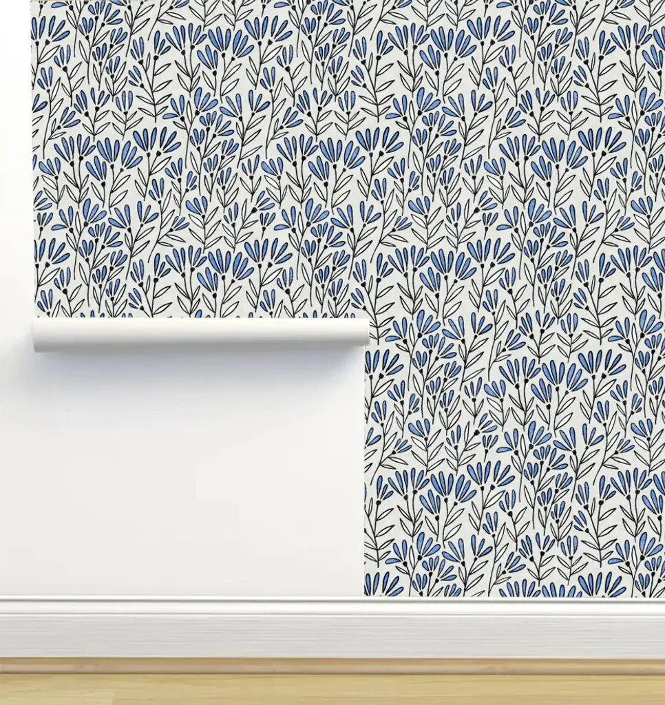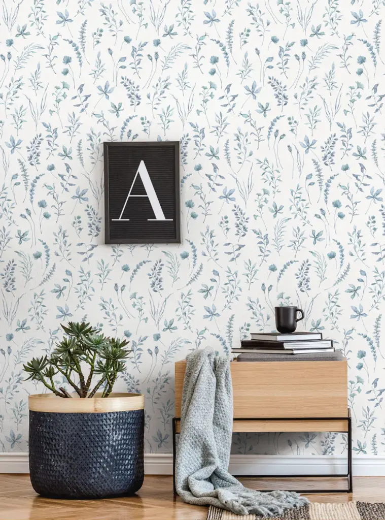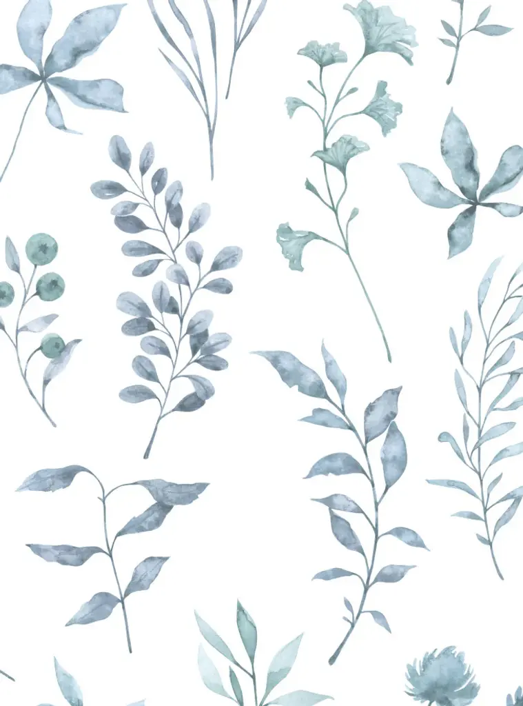 Watercolor Botanical Leaves Peel And Stick Vinyl Wallpaper, Blue, 24"w X 60"h