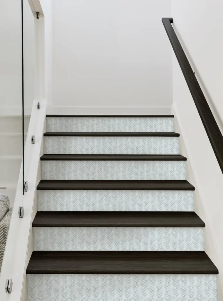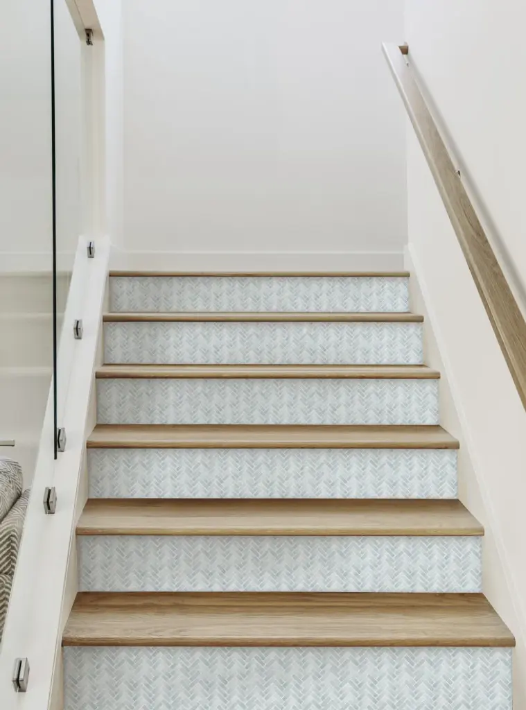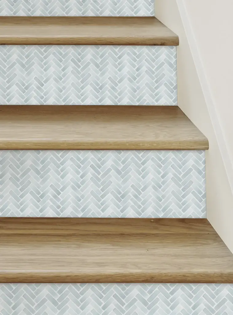 Watercolor Herringbone Peel And Stick Stair Riser Strips, Misty Blue, 48"w X 7"h, 6 Pack