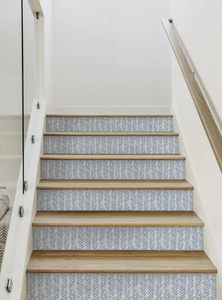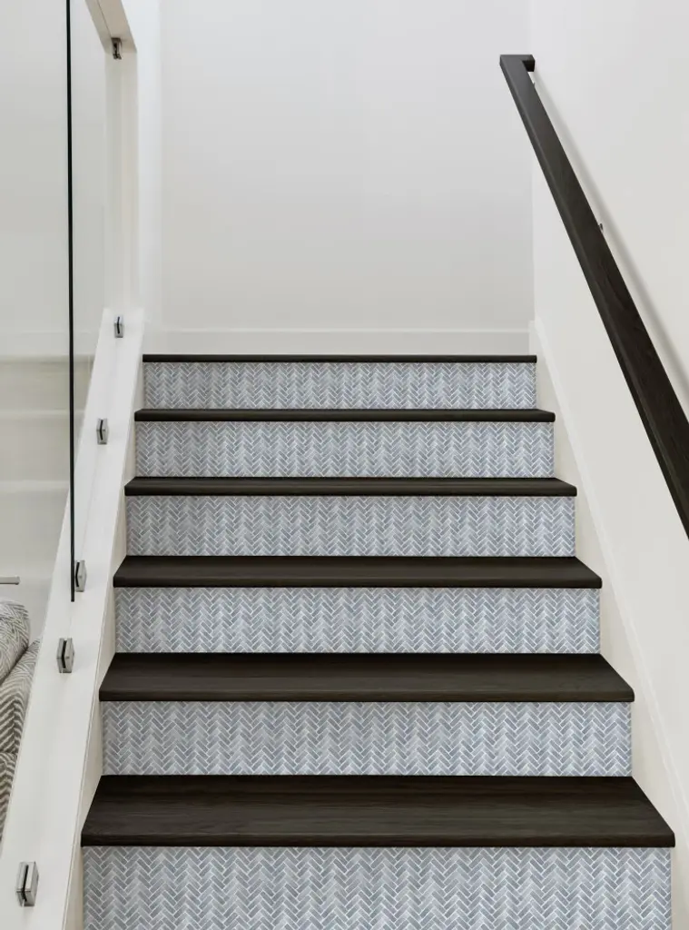 Watercolor Herringbone Peel And Stick Stair Riser Strips, Van Deusen Blue, 48"w X 6"h, 6 Pack