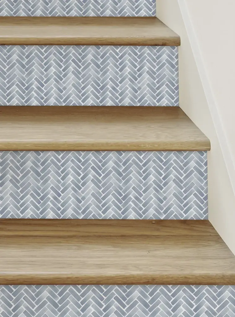 Watercolor Herringbone Peel And Stick Stair Riser Strips, Van Deusen Blue, 48"w X 7"h, 6 Pack