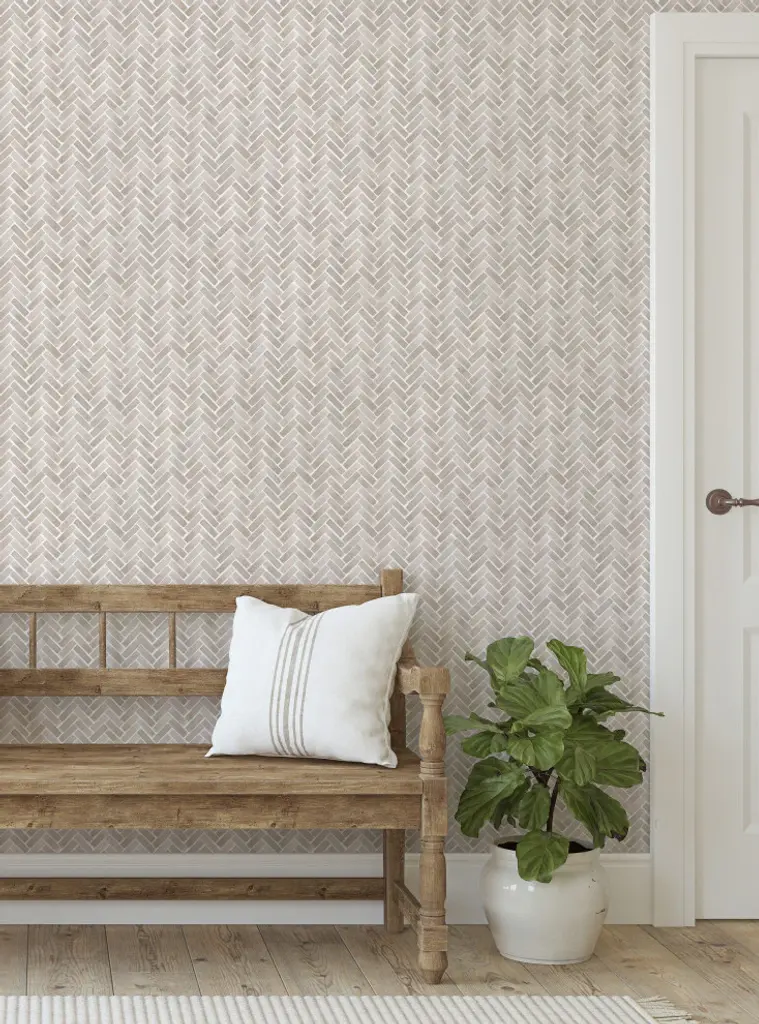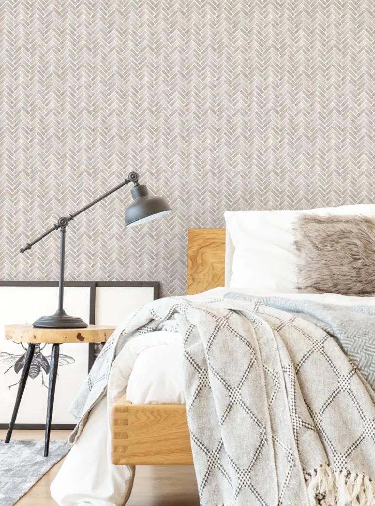 Watercolor Herringbone Peel And Stick Vinyl Wallpaper, Beige Grey, 24"w X 60"h