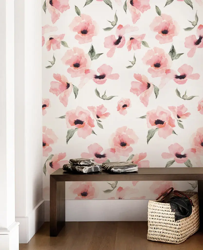 Watercolor Poppy Flowers Peel And Stick Vinyl Wallpaper, 24"w X 60"h
