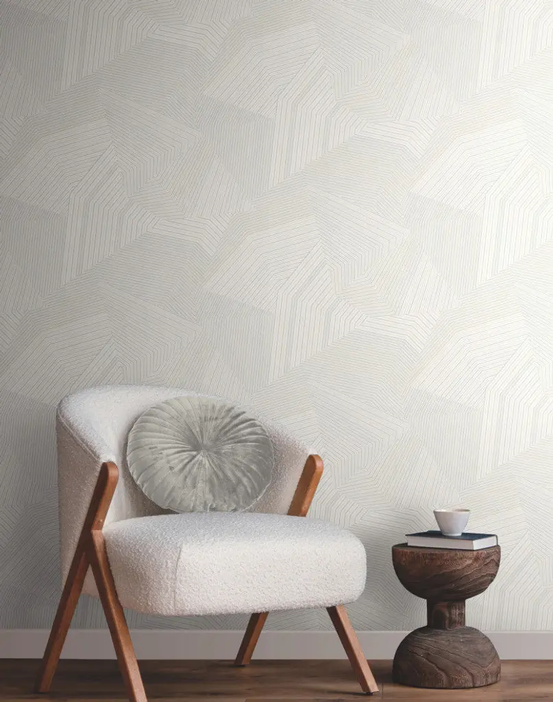 Fractured angles, metallic lines, and stitches become the framework of "the new modern abstract" Dotted Maze, shown in off white with glint. This Dotted Maze Wallpaper measures approximately 27 inches wide by 27 feet long, measuring approximately 60.8 square feet per roll. The modern aesthetic of natural form. Unpasted non woven material25.25-in repeat, drop matchWashable and strippable27-in by 27-ft long rollCovers about 60.8 square feet