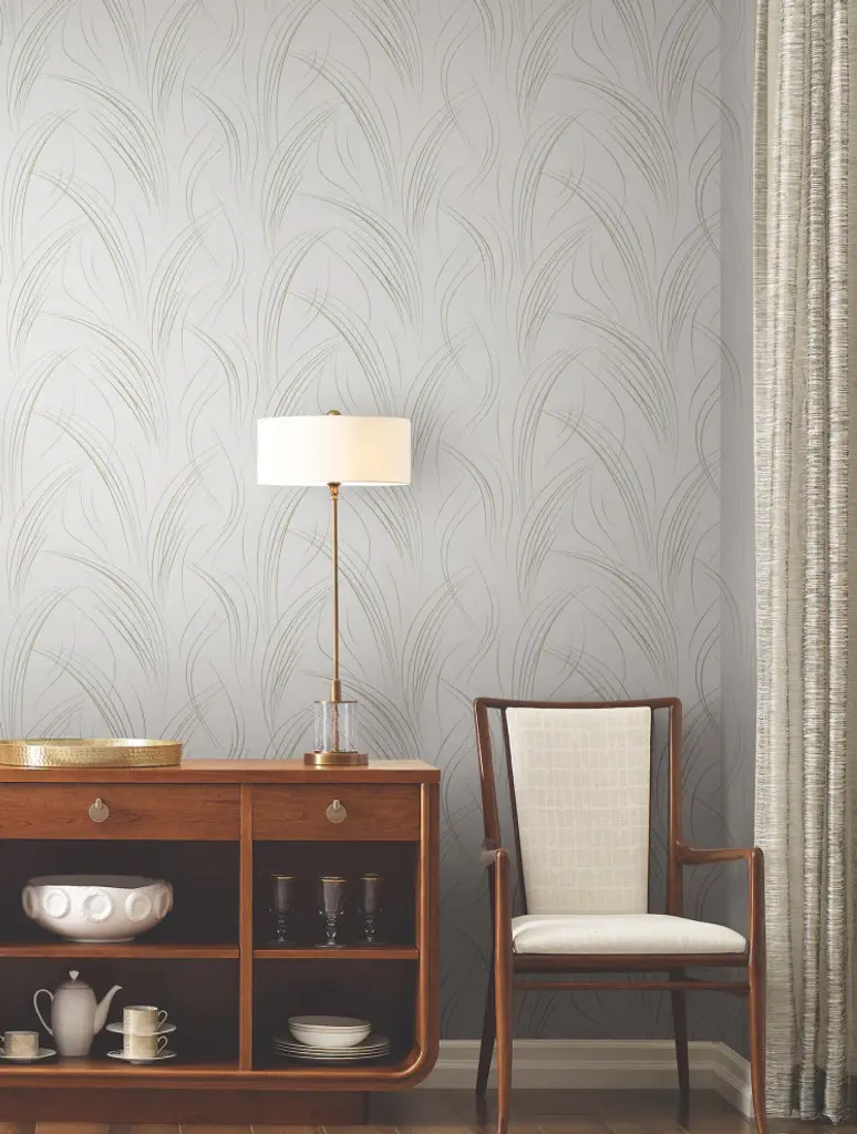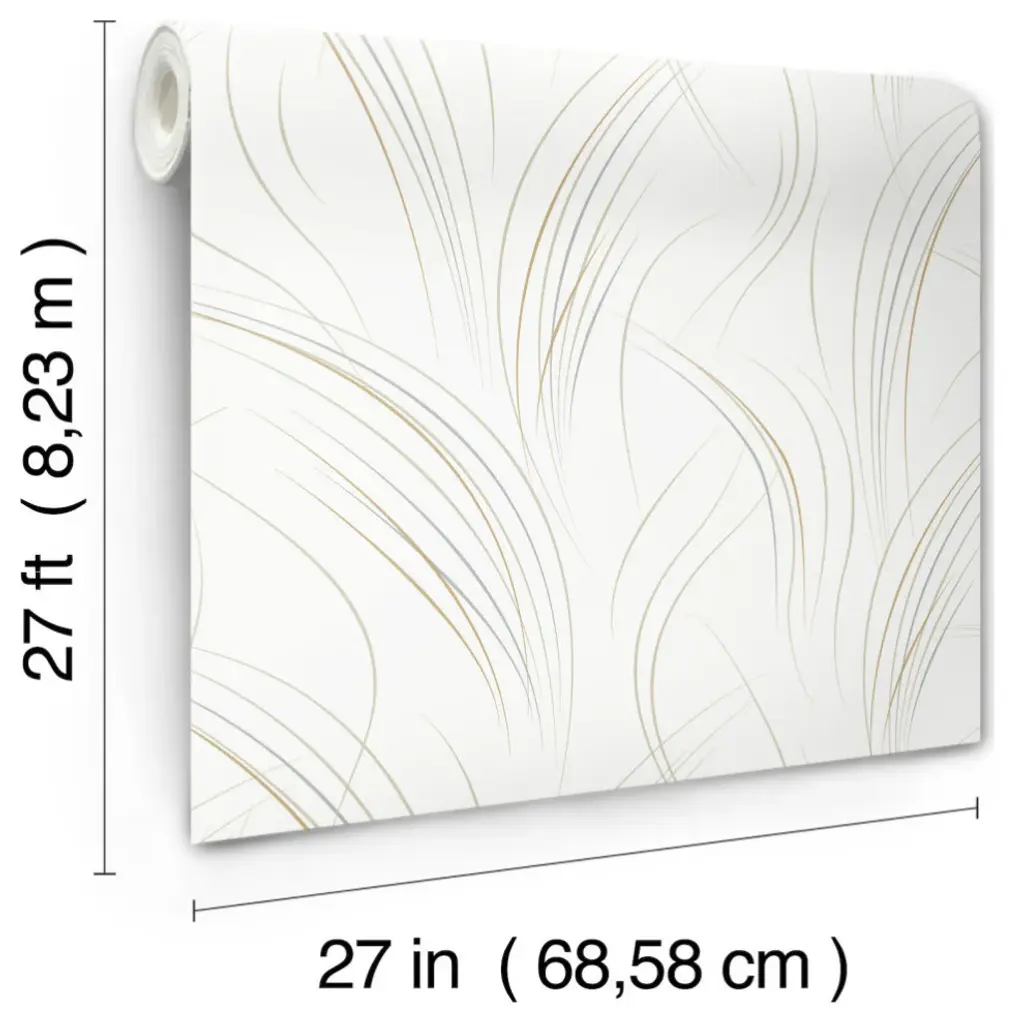 The elegant golden brown, beige, and blue-grey lines of swaying grasses give the pattern Graceful Wisp a fresh, modern appeal, with metallic accents adding to its contemporary feel. This Graceful Wisp Wallpaper measures approximately 27 inches wide by 27 feet long, measuring approximately 60.8 square feet per roll. Organic simplicity and lustrous adornment for the modern home. Unpasted non woven material25.25-in repeat, drop matchWashable and strippable27-in by 27-ft long rollCovers about 60.8 square feet