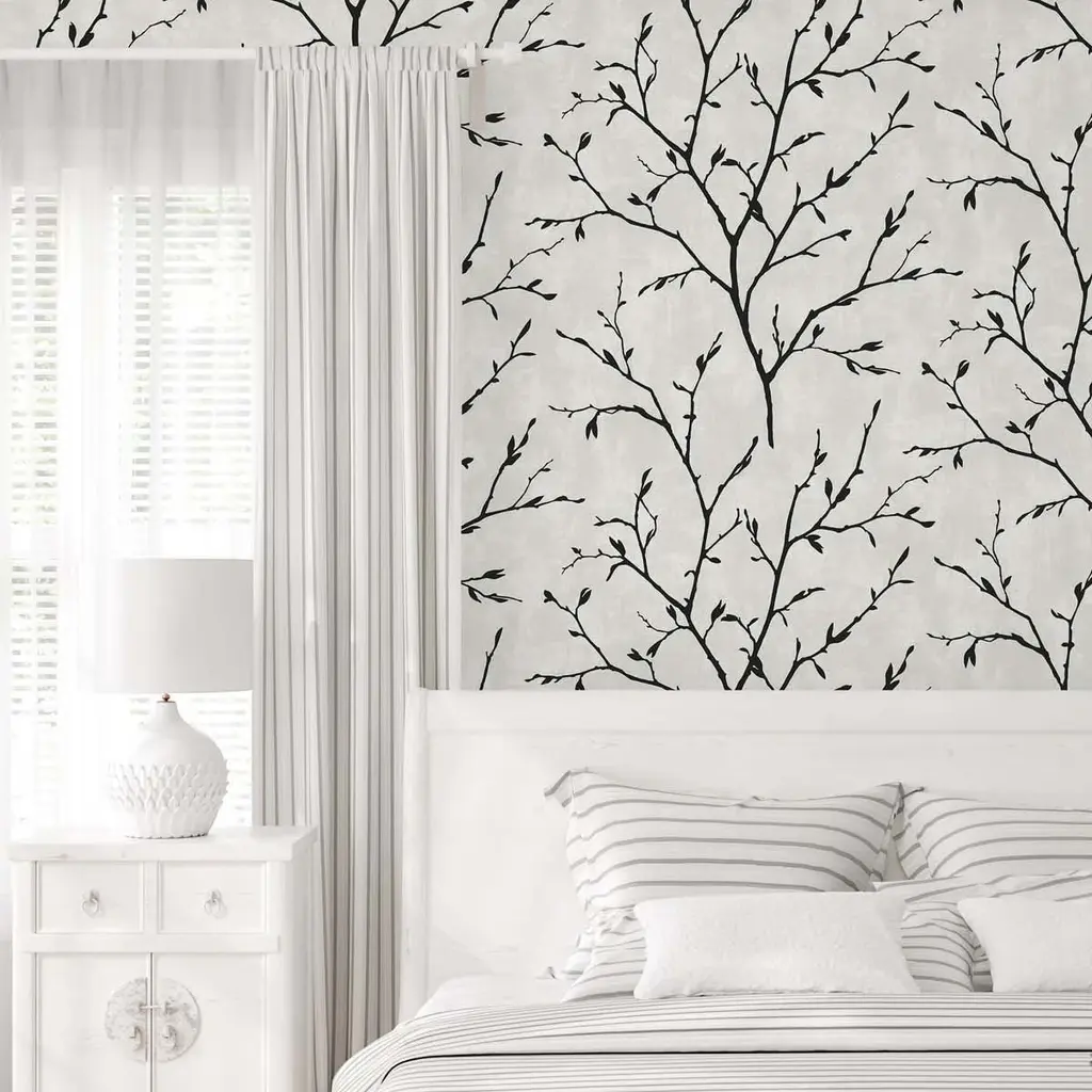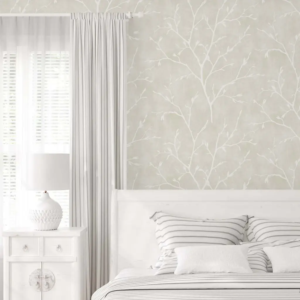 Transform your space into a minimalist haven with the White Heron Avena Branches Wallpaper from Seabrook Designs. Featuring intricate tree silhouettes on a faux plaster backdrop, this screen-printed wallpaper exudes sophistication and chicness. Elevate your interior with this high-quality, nonwoven paper. Highlights