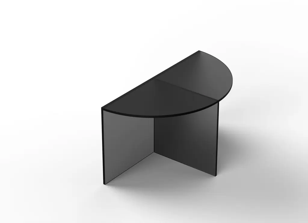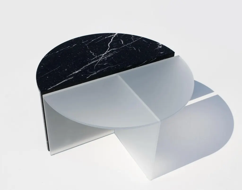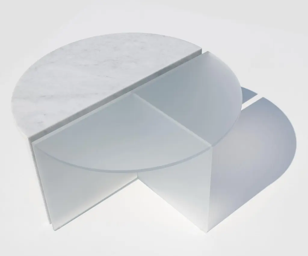 White satin glass "Fifty Circle" coffee table - Sebastian SchererDimensions: 35 H x 35 W x 70 D cmMaterials: marble, glass, frosted glassDifferent colors and sizes are availableFifty coffee tables appear very simple but can be combined in a variety of ways creating an interesting mix of form and material. The tables are composed of a half-circle or a half-oblong. The arrangement of two identical elements or a combination of both creates a contrasty interaction of geometry and materiality. Available in glass, marble and oak.The NEO/CRAFT label was founded by the Berlin-based designer Sebastian Scherer after he won the Lexus Design Award 2014 for his Iris lamp (2013). The debut collection, which consisted of ten products, was first presented at the imm cologne in January 2015 in what Wallpaper Magazine described as “one of the most impressive debuts in 2015.” Exhibitions at trade fairs in Milan and London followed this same year. Since then, Sebastian Scherer has worked as a designer and creative director in equal measure. The collection consists of his designs, but these can also undergo further development in the future through the input of other designers. The central element in his developmental process is the continual search for new creative possibilities with classical materials such as aluminum, steel, glass and wood.