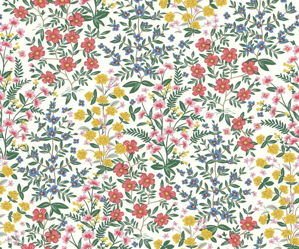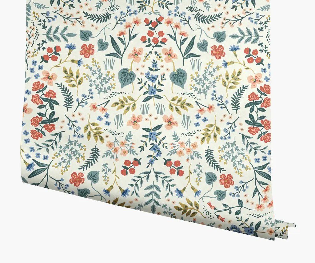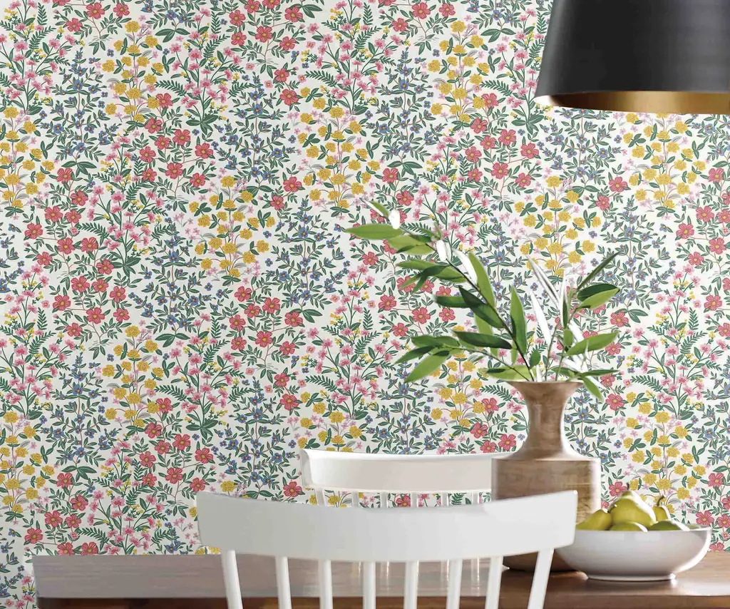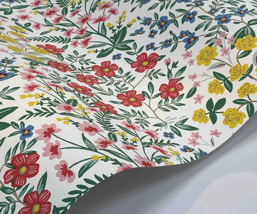 The layered florals of Wildwood Garden create a color-blocked look, with each bloom grouped by bright hue. This wallpaper is screen printed and comes in 27 inch rolls with a 25.25 inch repeat. Due to the printing process, there may be color variations in different print runs. We suggest purchasing all wallpaper needed for a project at one time for the best color consistency. Unopened rolls can be returned.