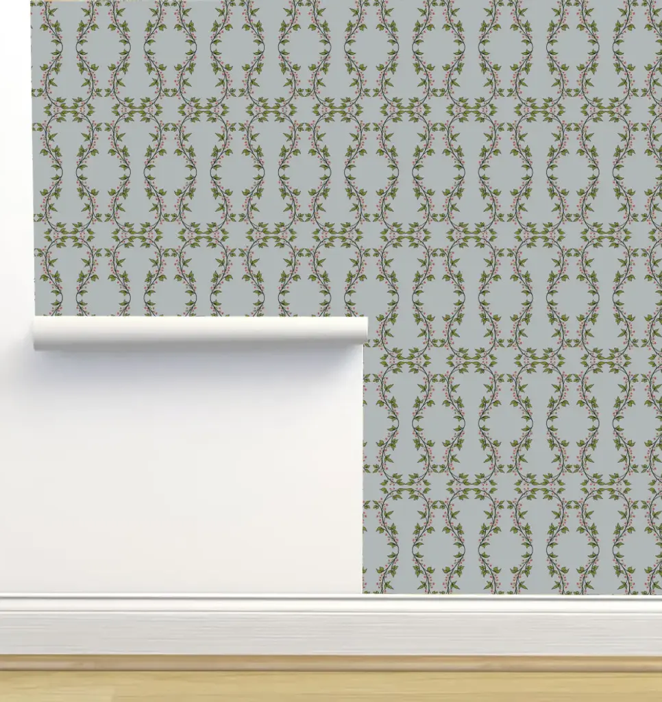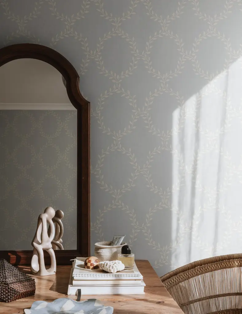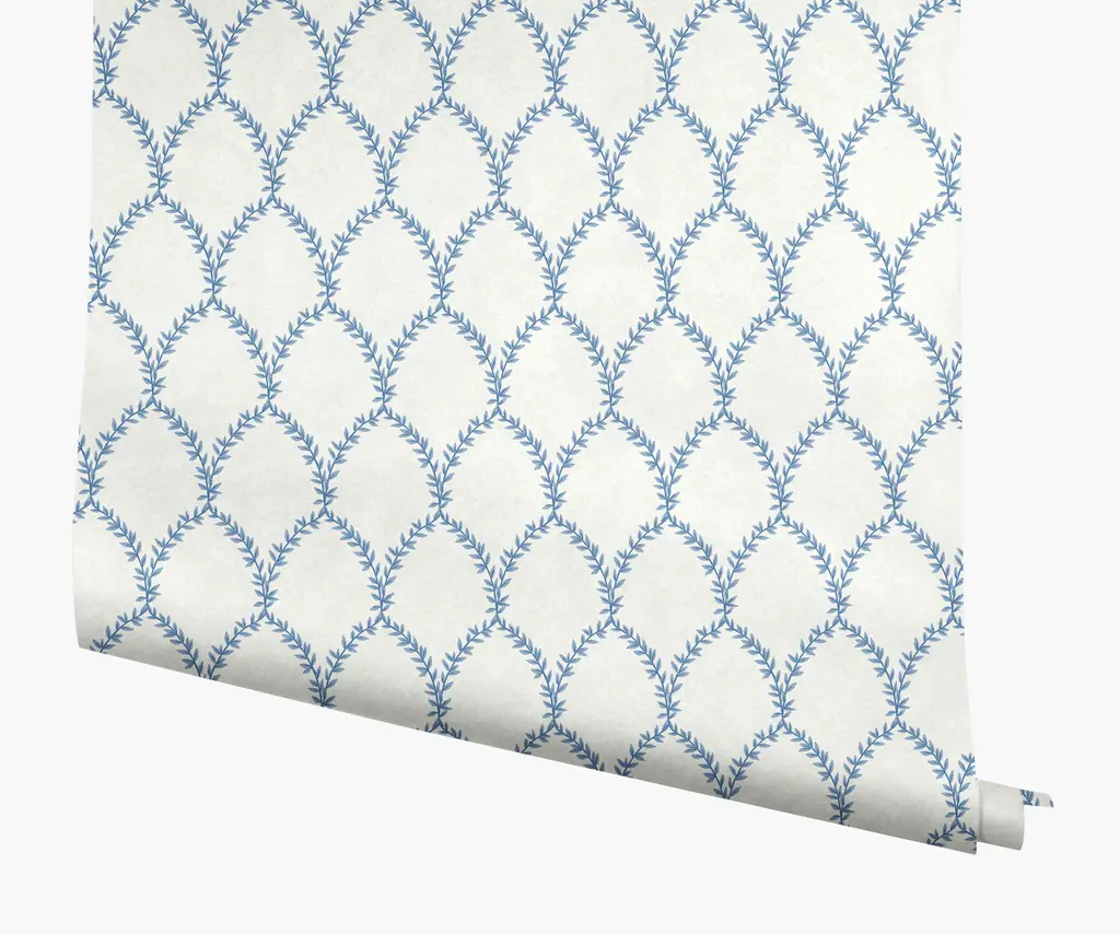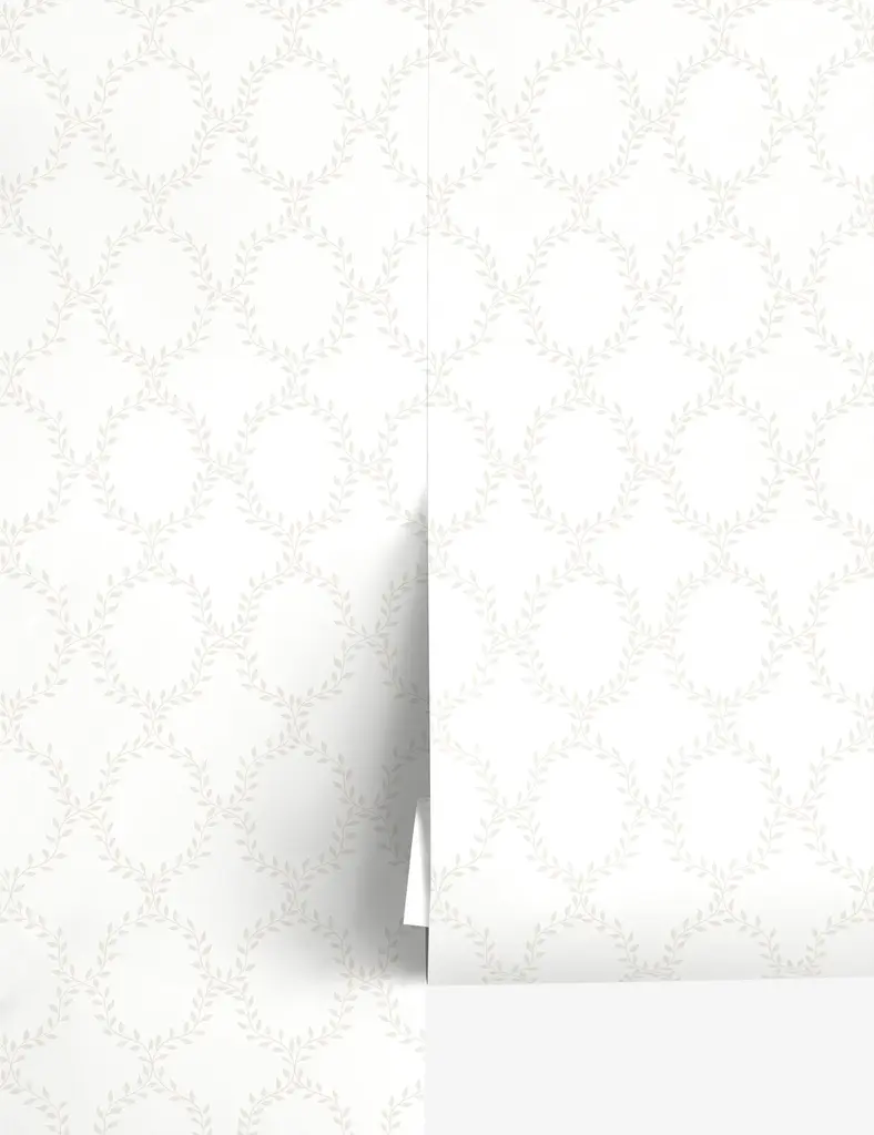 A laurel trellis fills this beautifully patterned wallpaper with botanical details in a striking geometric design. We love the lush yet subtle visual texture of this versatile wallpaper for a living room accent wall or full-coverage in a bedroom or bath.