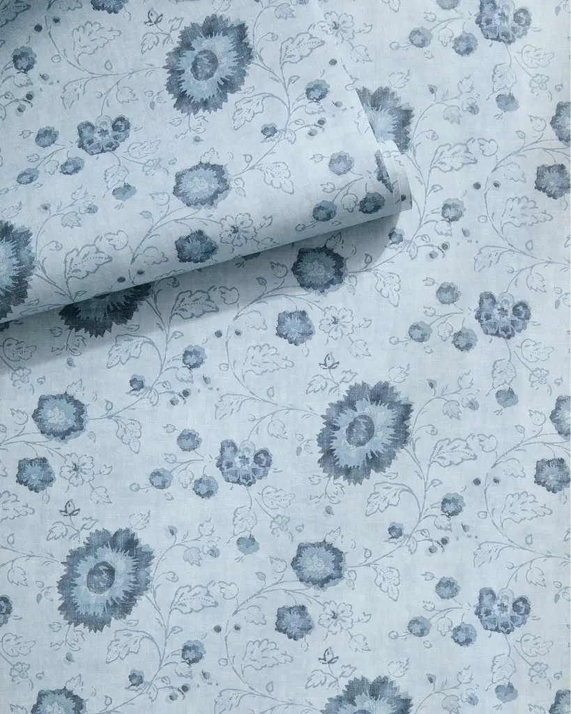 Winsome lines and tangled stems wander freely across a linen ground. A sprawl of flora, a canvas of untamed splendor.
