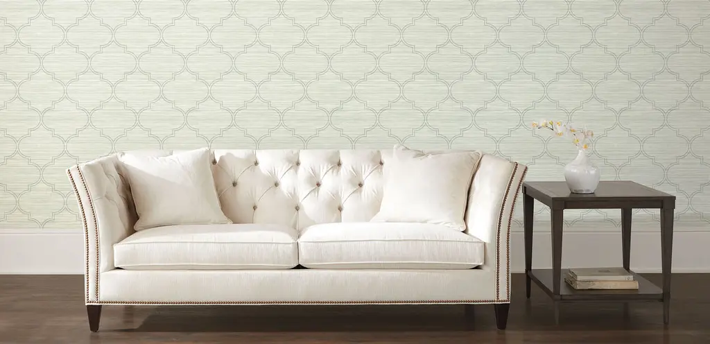 Faux grasscloth stamped with a bold ogee pattern—Xavier wallpaper can make a subtle or dramatic statement depending on which colorway you choose. It mixes gorgeous woven texture with the easy cleanability of vinyl.