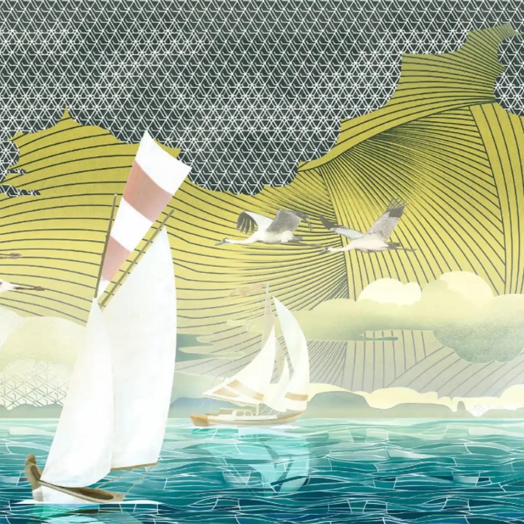 The Yellow & Blue Sea Polyester Wallcovering Fabric encapsulates the coastal charm of California. The design draws inspiration from the Art Deco storytelling style, evoking the spirit of 40s and 50s travel posters. Featuring a captivating scene that juxtaposes ocean and sky, sailboats and sweeping herons, this fabric is designed to breathe life into any interior. Crafted with precision, the satin-finish fabric not only enhances aesthetic appeal but also ensures breathability and sound absorption, making it ideal for creating a serene atmosphere. The vibrant color variant adds a striking visual impact, perfectly complemented by an array of five available color options. The price is per square meter and the piece is also available in an alternative height of 270 cm. Please contact the Concierge for additional information.