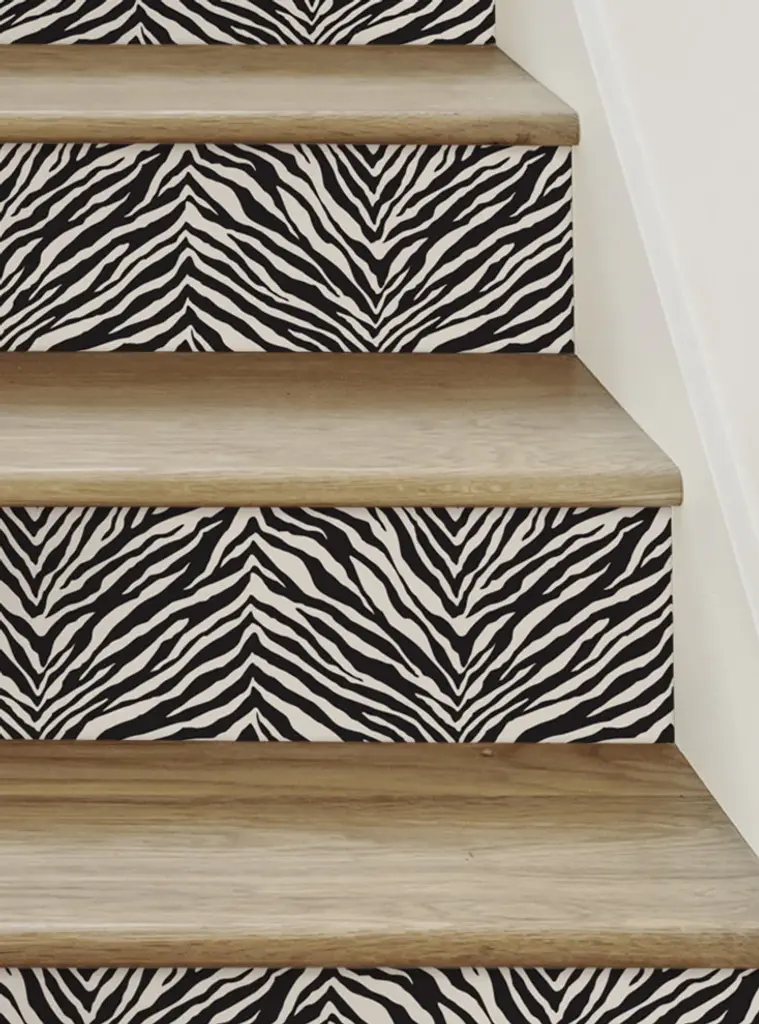 Take a walk on the wild side with our Zebra Print Peel and Stick Stair Riser Strips! The zebra stripe pattern is perfect for adding a touch of the savannah to your staircase! DIY decorating has never been easier with this repositionable vinyl that can be easily applied and removed without any stress or mess!This re-positionable wallpaper is designed and made in our studios in New Jersey. The designs are printed onto an adhesive-backed vinyl that can be removed, repositioned, and reused. The wallpaper does not leave residue on your walls and is ideal for DIY room makeovers without the mess and headaches of traditional wallpaper.Size:48"w x 6"h48"w x 6.5"h48"w x 7"h48"w x 7.5"h