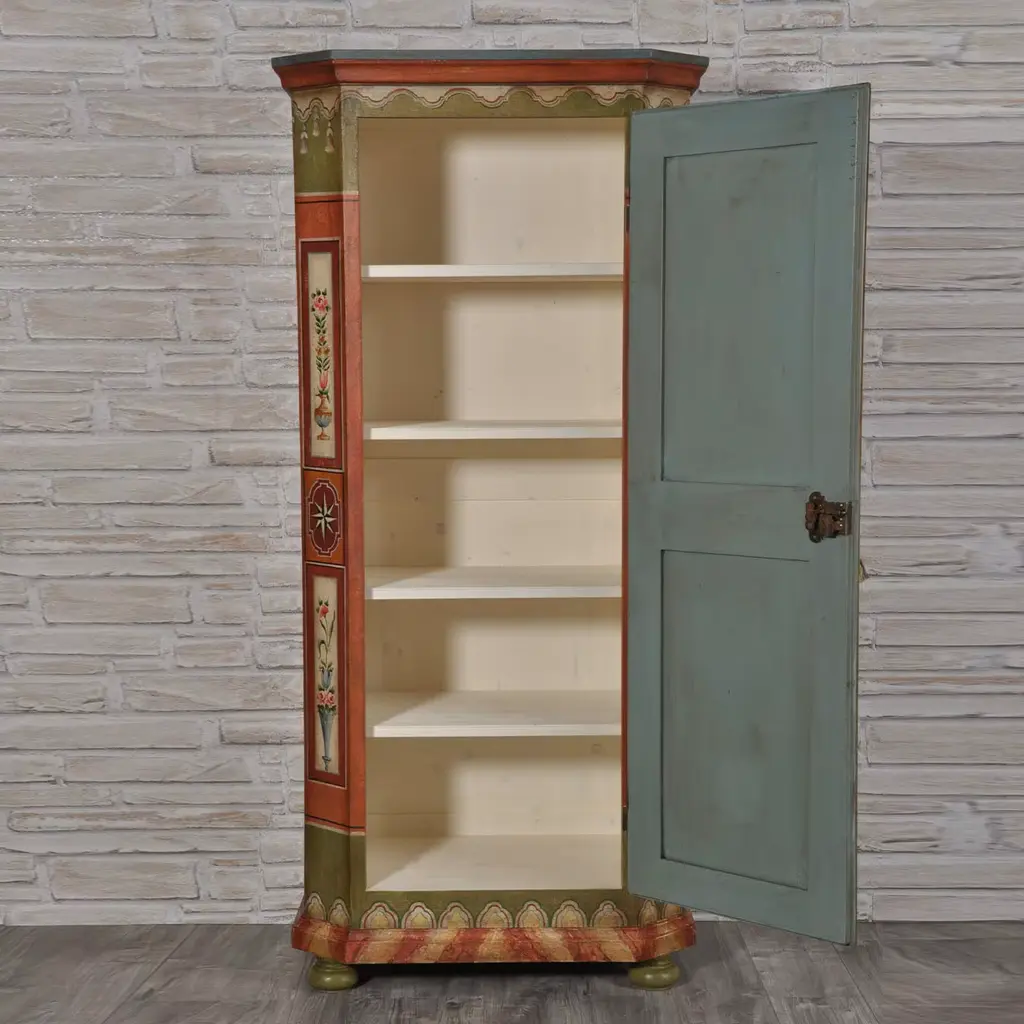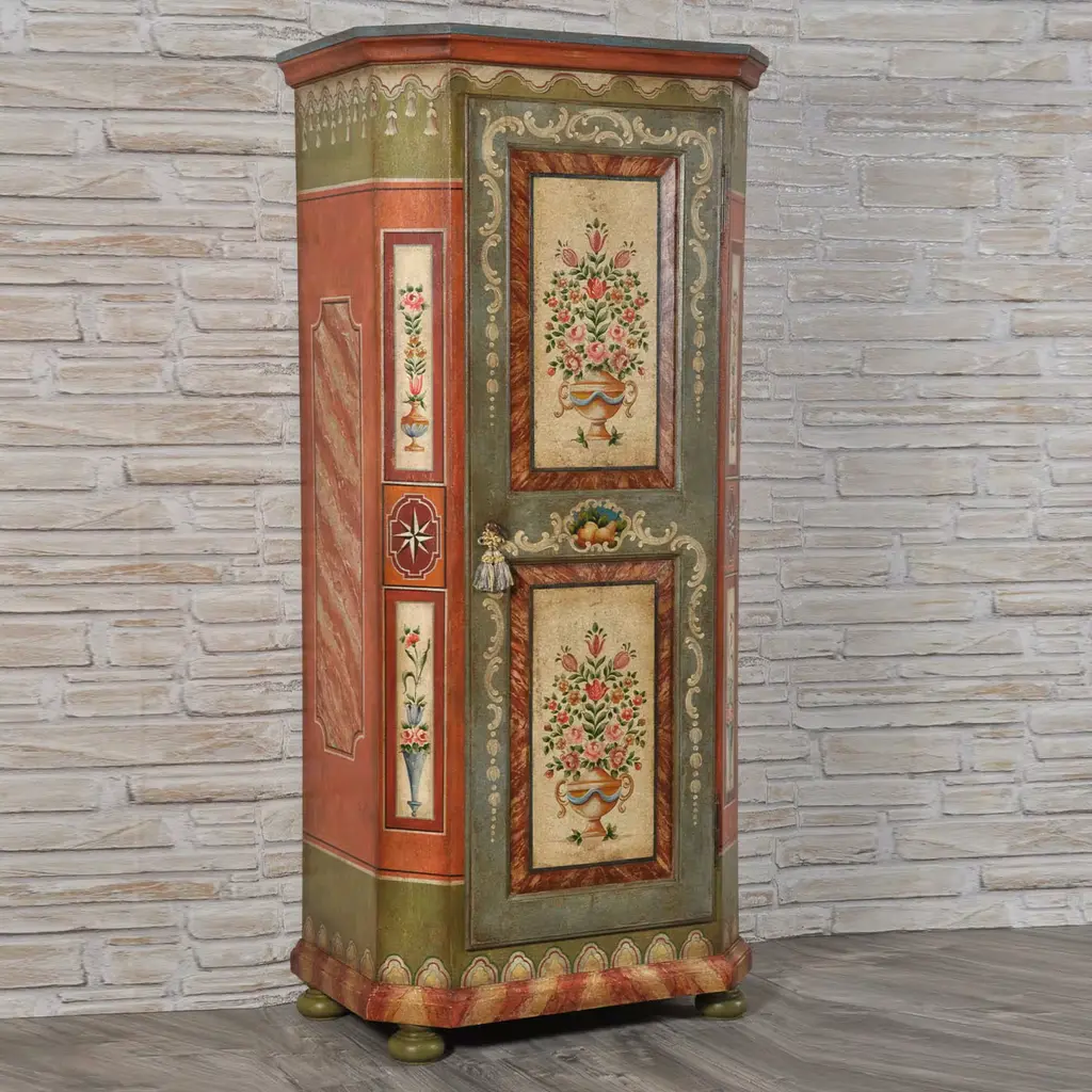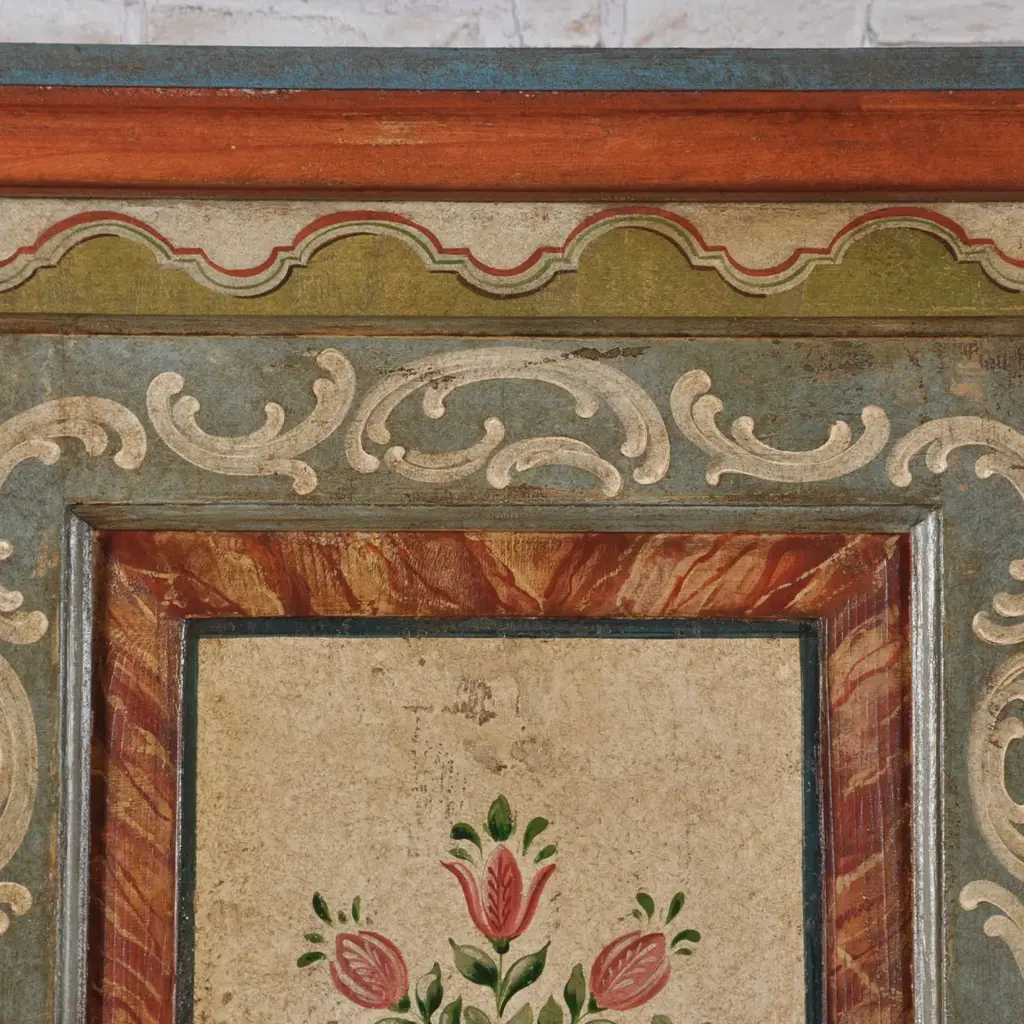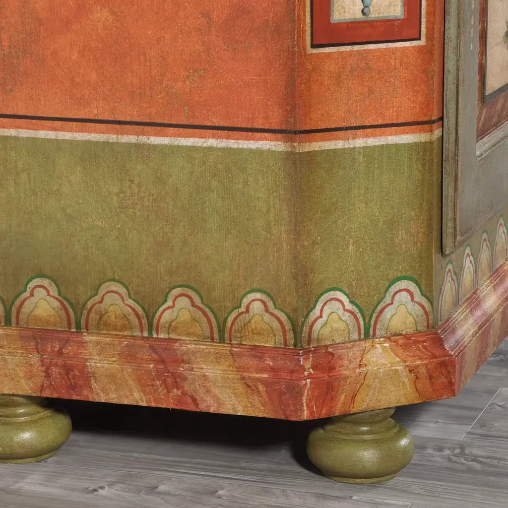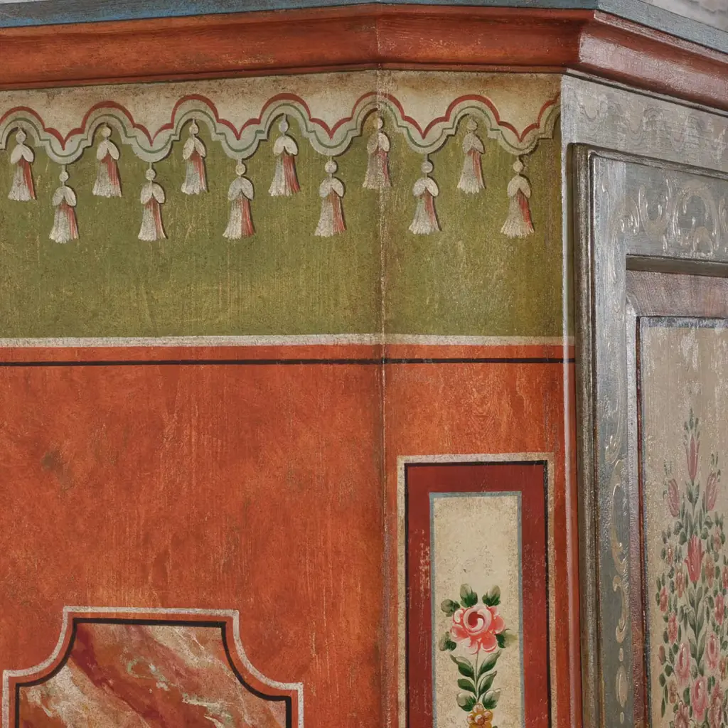 A true cabinetmaking gem, this wardrobe is a faithful artisan reproduction of an original Baroque Tyrolean design from the late 17th century. A triumph of minutely handpainted floral and geometric decorations adorns the piece, raised on four turned legs and completed by iron lock and hinges all deftly forged by hand following traditional techniques. Contact the Concierge for customizations.