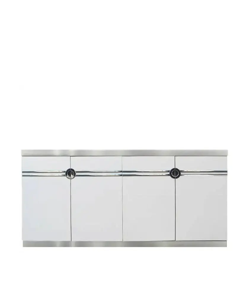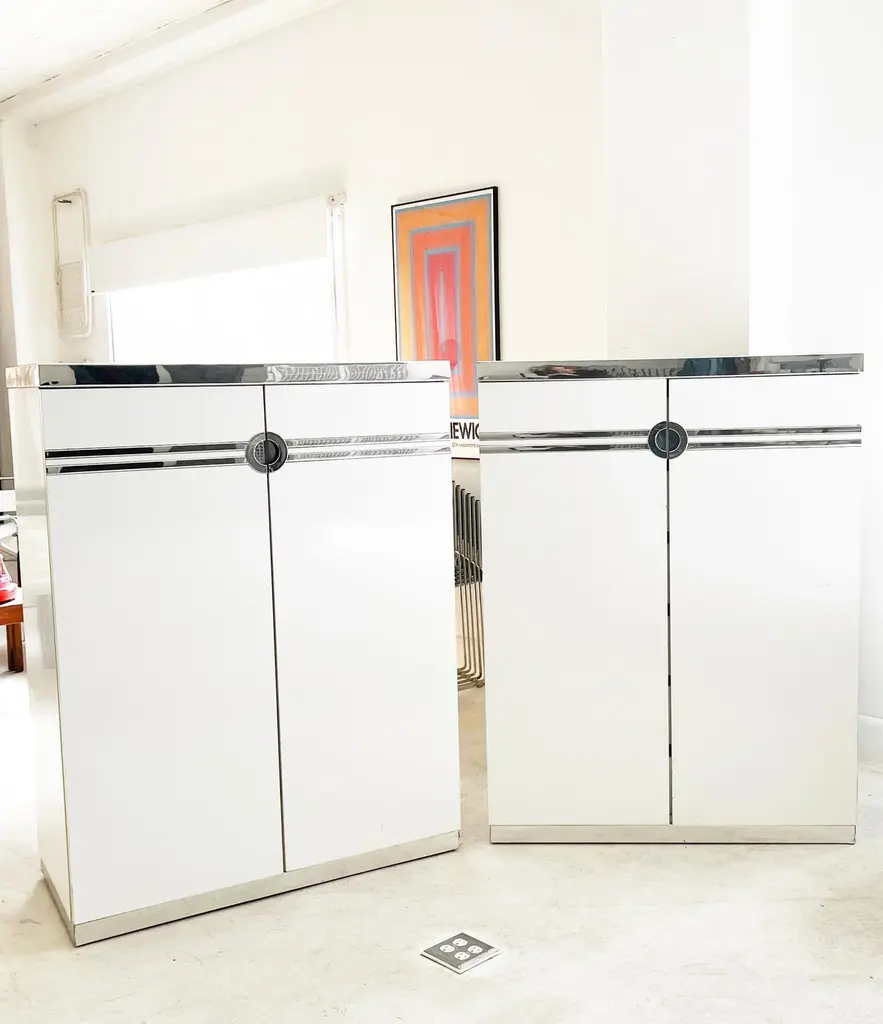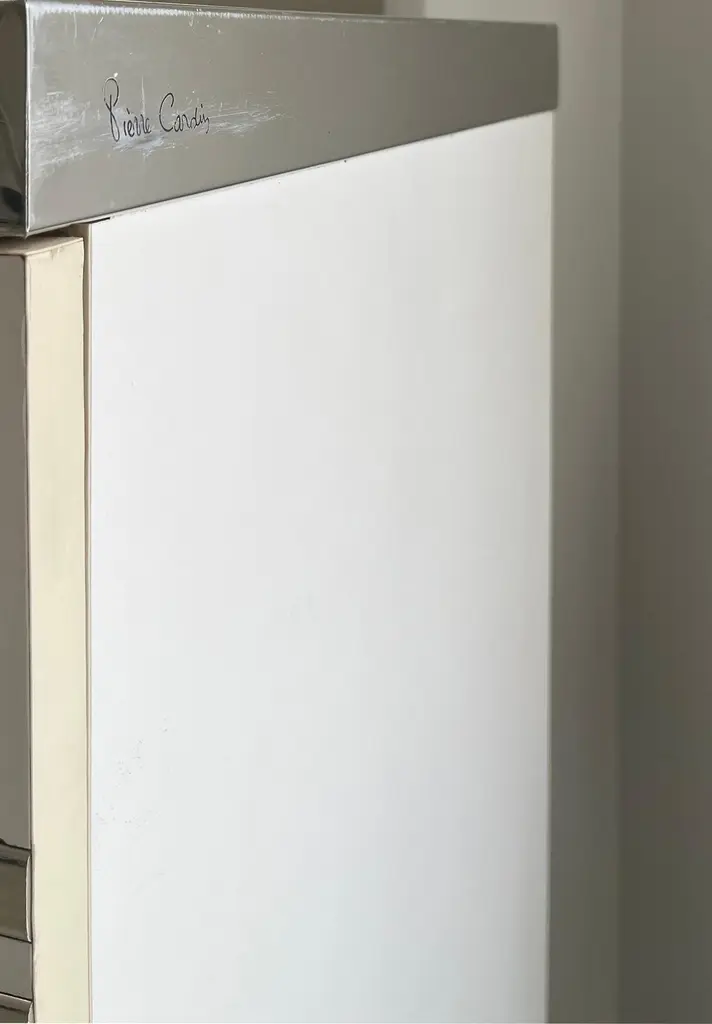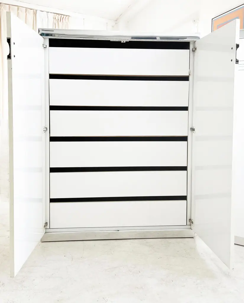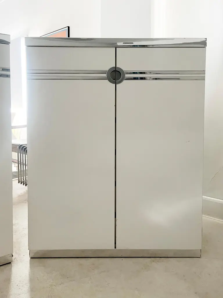1970s Pierre Cardin Art Deco Revival tall wardrobe dresser cabinets. Double doors open to reveal six spacious pull-out drawers. Manufactured by Dillingham in the 1970s. The pieces are wood and white laminate with aluminum banding polished to a chrome-like mirror finish. Impressed signature of the designer, Pierre Cardin. Circa 1970s. Two are available and priced individually.