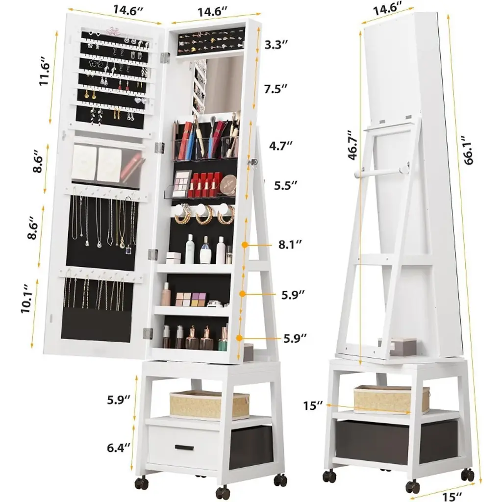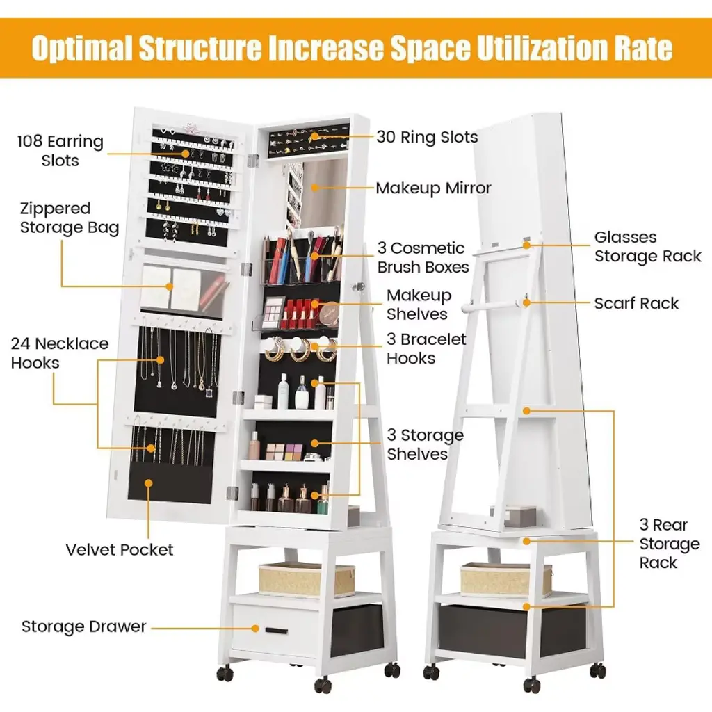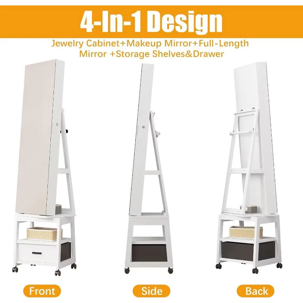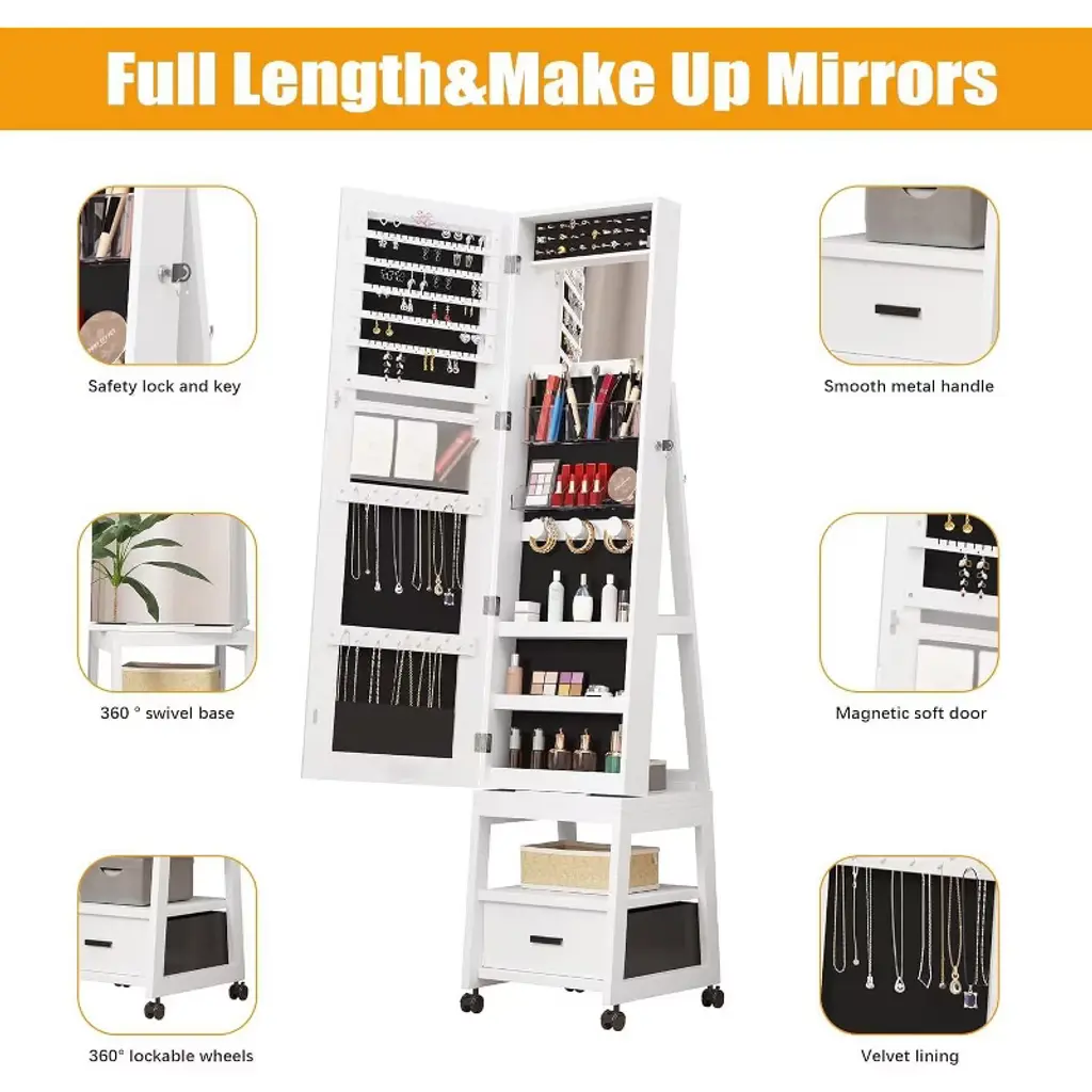 360° Swivel Jewelry Armoire, Floor Standing Locking With Full Length Mirror,bottom Drawer, Shelf, Wheels, Cabinet With Storage Capacity, White