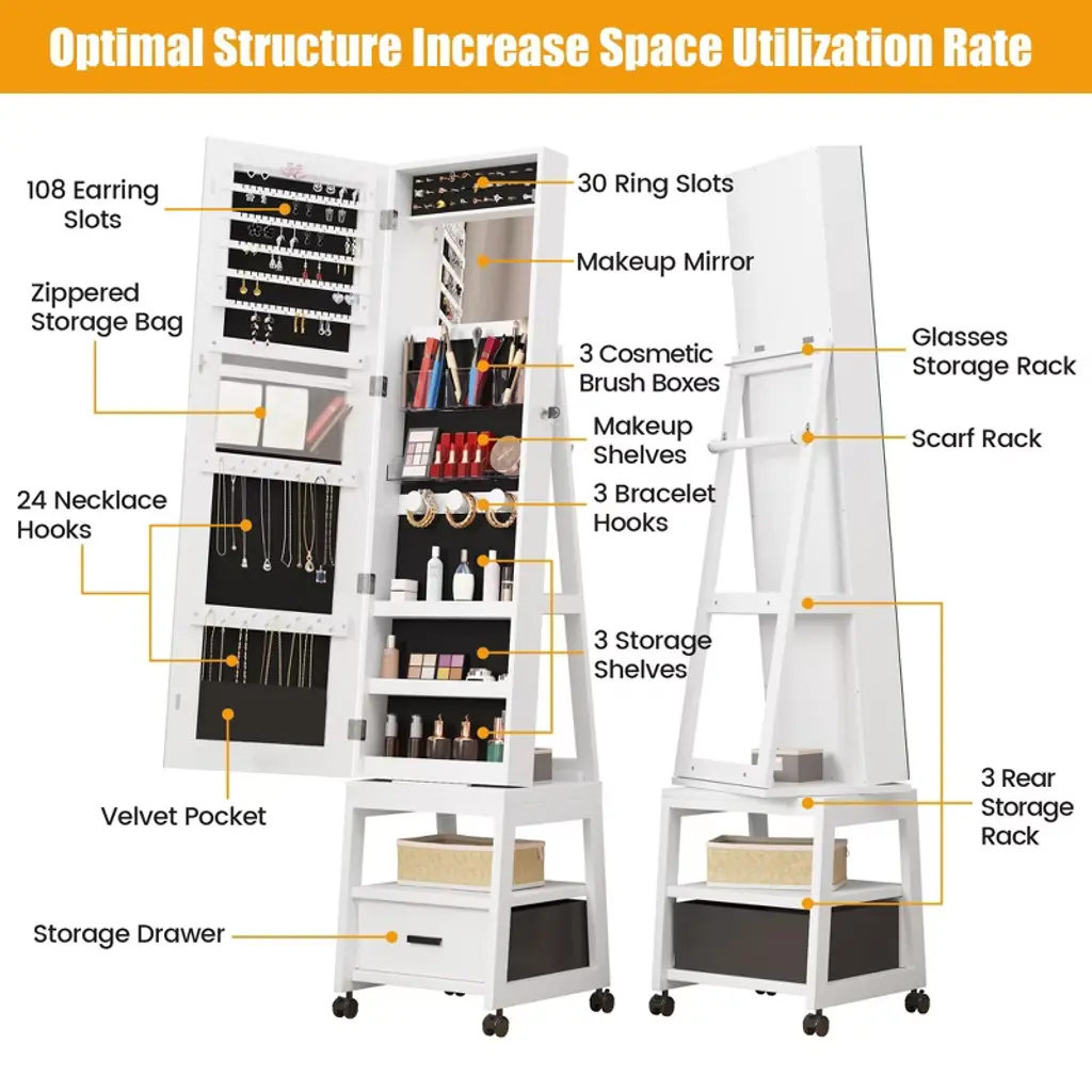 360¡ã Swivel Mirror Jewelry Cabinet, 66 Inch Full Length Mirror With Standing Jewelry Armoire Organizer, Lockable Jewelry Storage Cabinet With Drawer