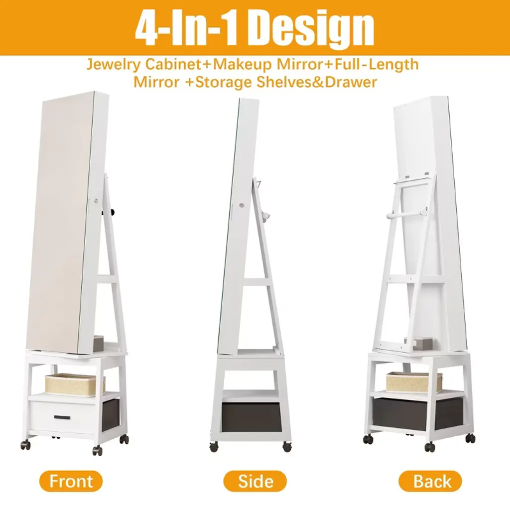 360¡ã Swivel Jewelry Cabinet, 66'' Freestanding Jewelry Armoire With Bottom Drawer, Lockable Full-Length Mirror With Rear Storage Shelves, Jewelry Armoire Organizer