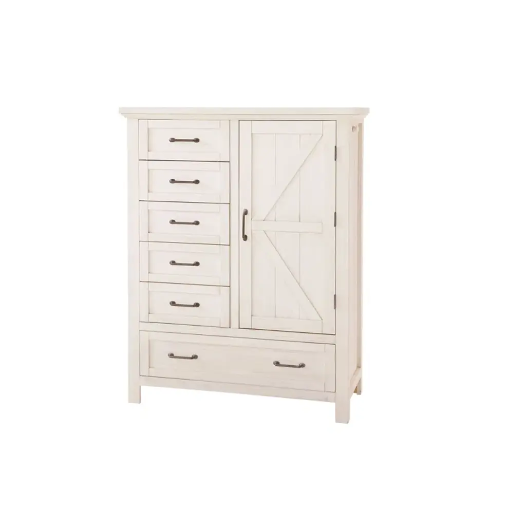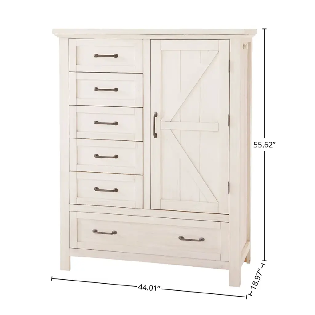 Bring elegance and security together with the Bartelso Wood Traditional Chifforobe. This carefully designed piece will bring a warm rustic touch to your nursery. It features 4 small and one large drawer, two shelves, and additional storage which includes a hanger bar. Perfect for storing any necessities, this charming chifforobe as it offers ample storage space for all your little one's essentials. Its beautiful Brushed White Finish delivers timeless charm to any bedroom decor.
