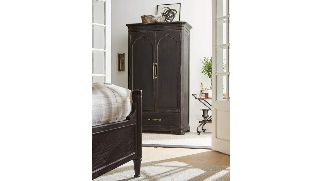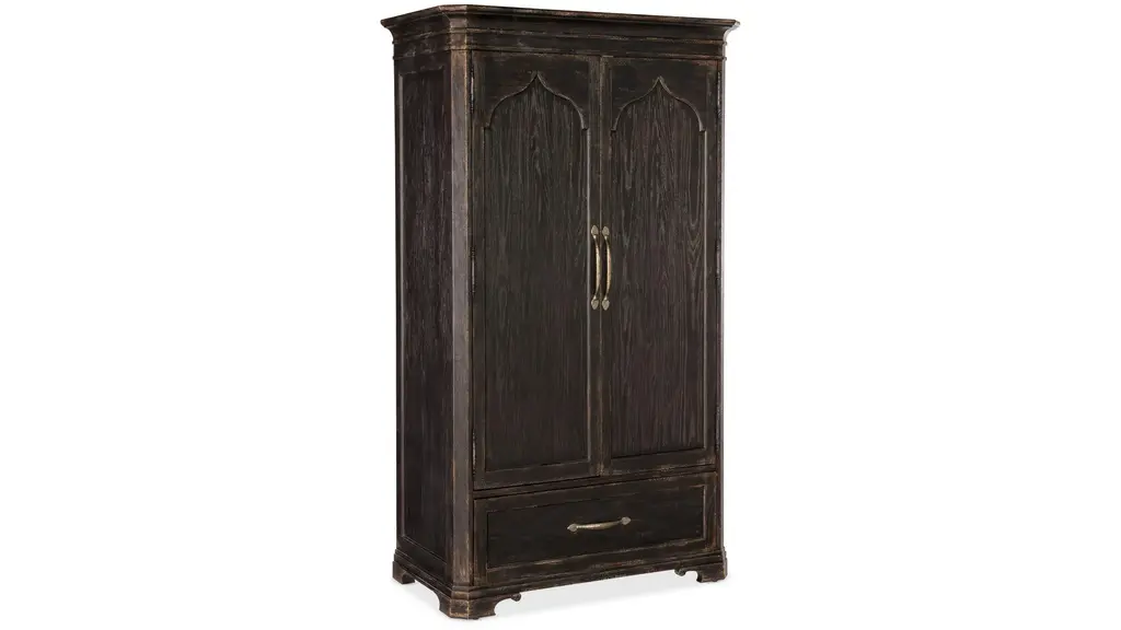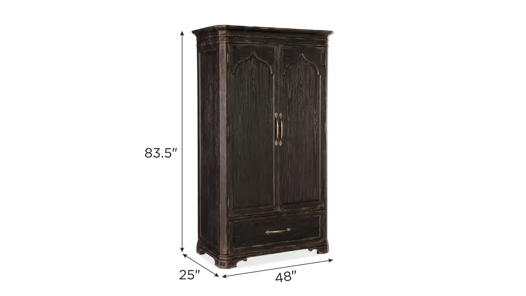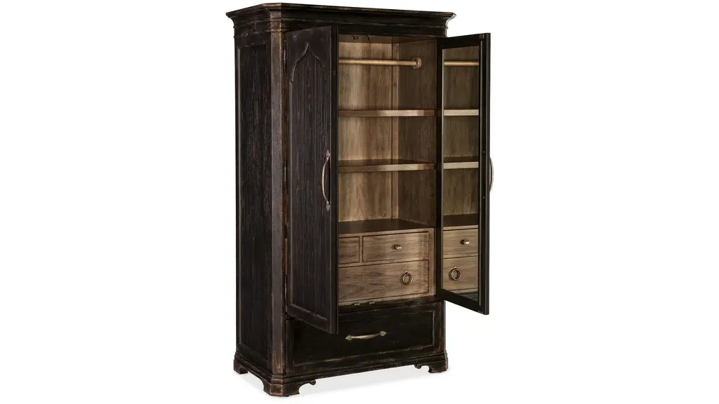 Reimagining an historical piece with a fresh take on finish, function, hardware and form, the Americana Wardrobe has shaped carved door fronts with an architectural arched design and scroll accents on the base. Crafted of oak veneers, it is finished in the time-worn white daisy with a warm honey interior finish. There's mirrored glass on the interior of the doors, one removable clothing rod, two adjustable wood shelves and 3 self-closing drawers. The top left drawer has black removable felt liner and the top right drawer has a black felt liner and black removable felt-lined jewelry tray. The one bottom drawer is self-closing.